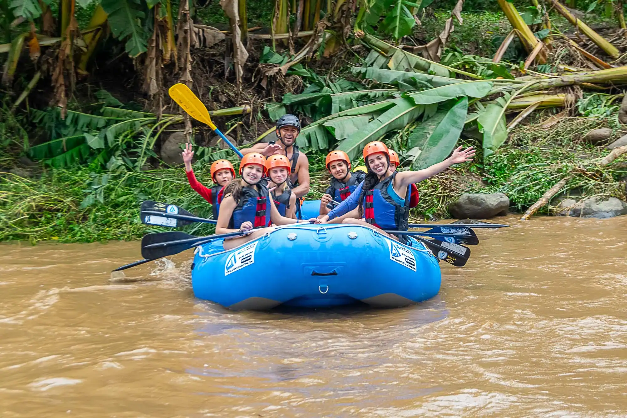 Six people wearing helmets and life jackets paddle a blue inflatable raft on a muddy river, smiling and waving at the camera with green foliage in the background—a thrilling moment from their Costa Rica student travel adventure.