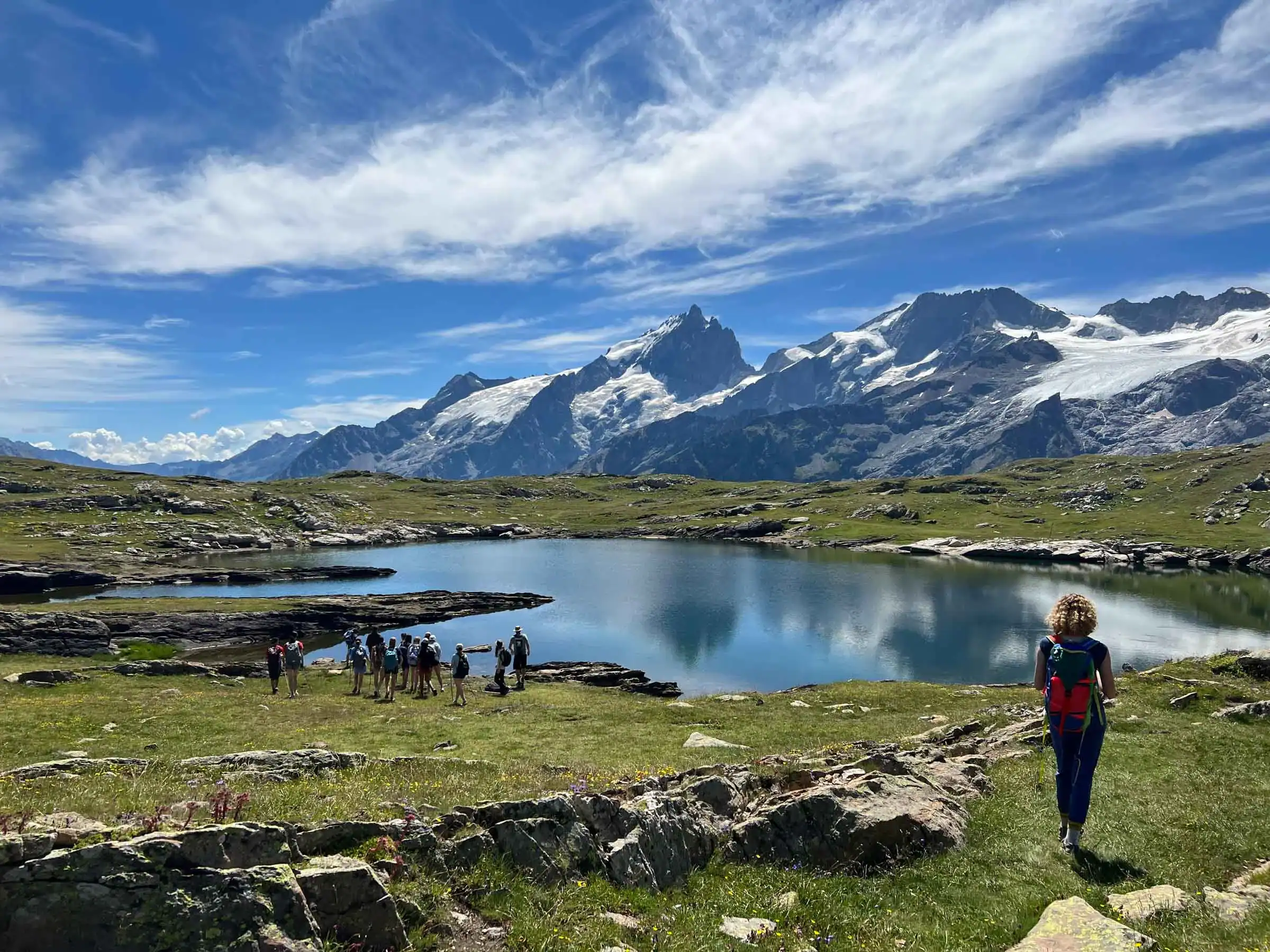 A group of student travelers by a lake with mountains in the background, while one person with a backpack—part of a student travel program—walks toward them under a partly cloudy sky.
