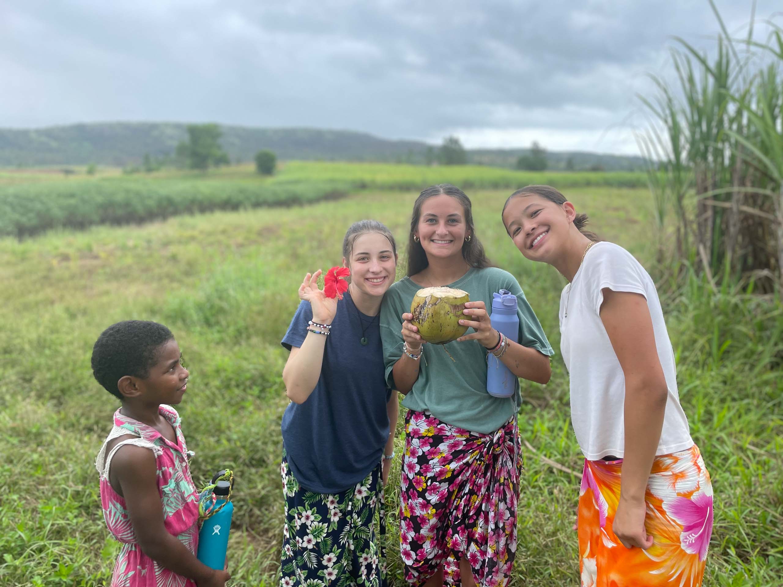 Four people smiling in a green field, two holding fruit. Overcast sky above.