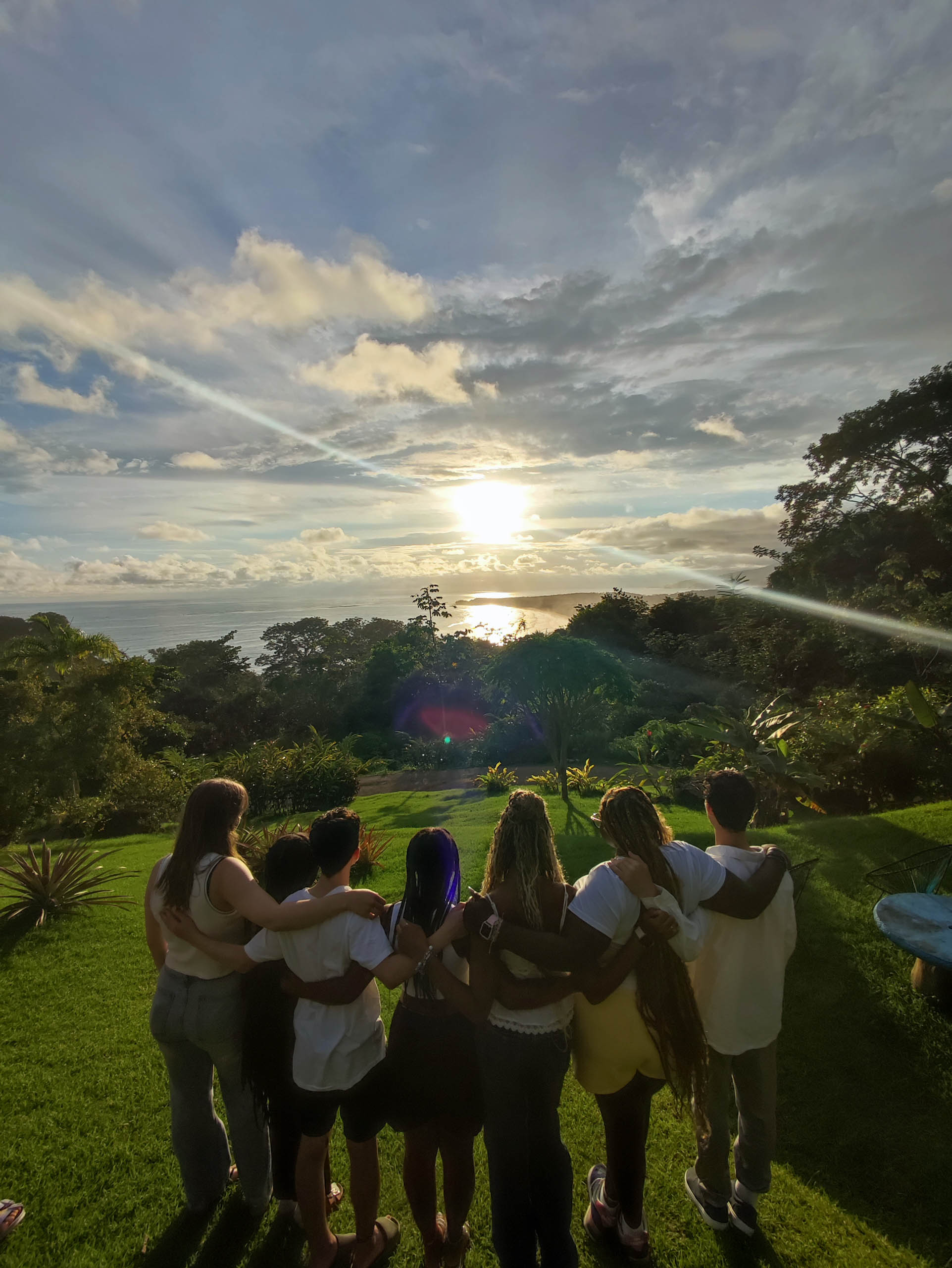 A group of people standing arm in arm on a grassy area, watching the sunset over a distant ocean.