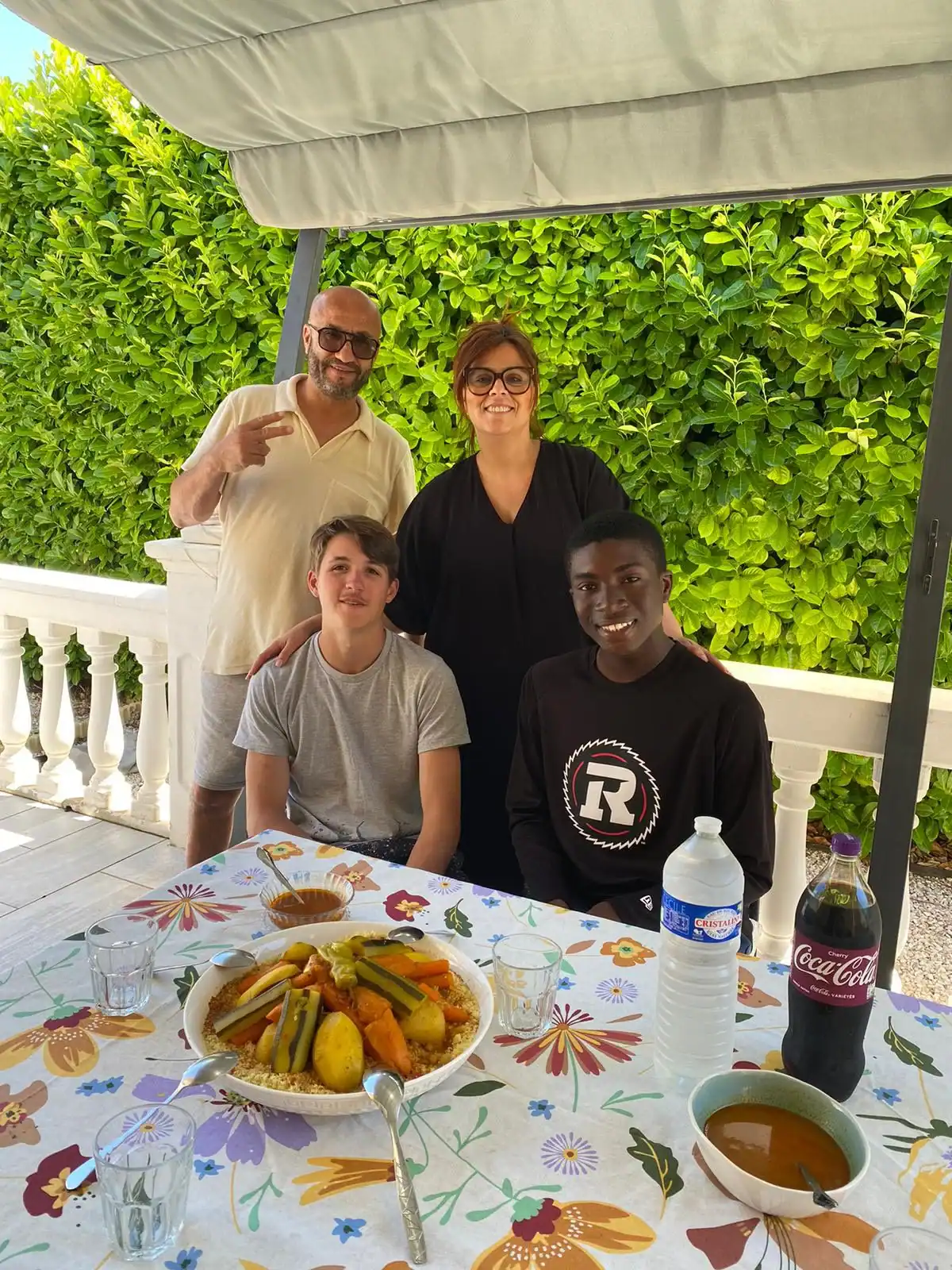 Four people pose and smile by a table set with food, drinks, and plates on a covered patio with greenery in the background during their language immersion trip.