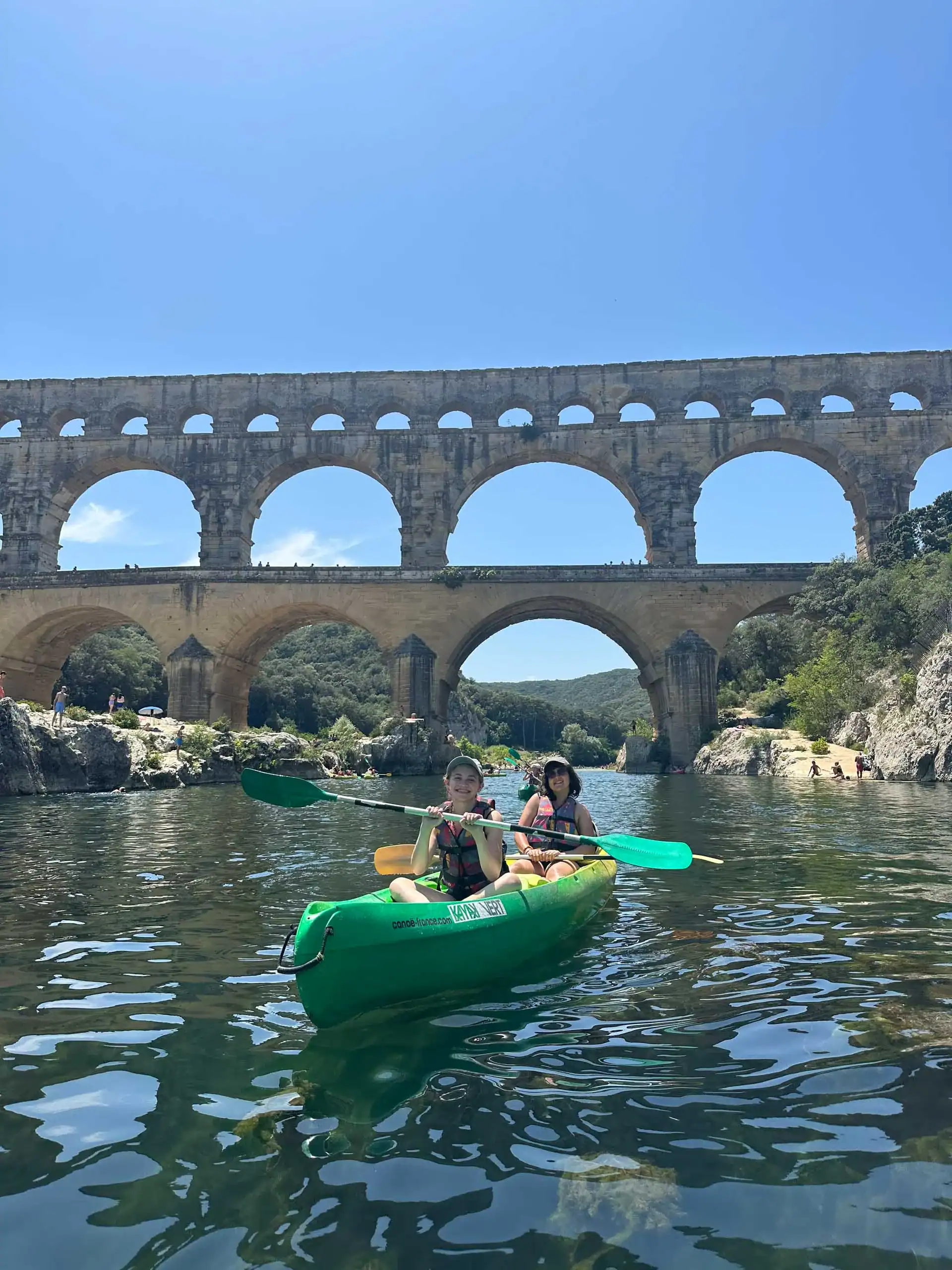 Two people kayaking on a calm river with the Pont du Gard Roman aqueduct in the background under a clear blue sky—a perfect scene from a student trip to France.