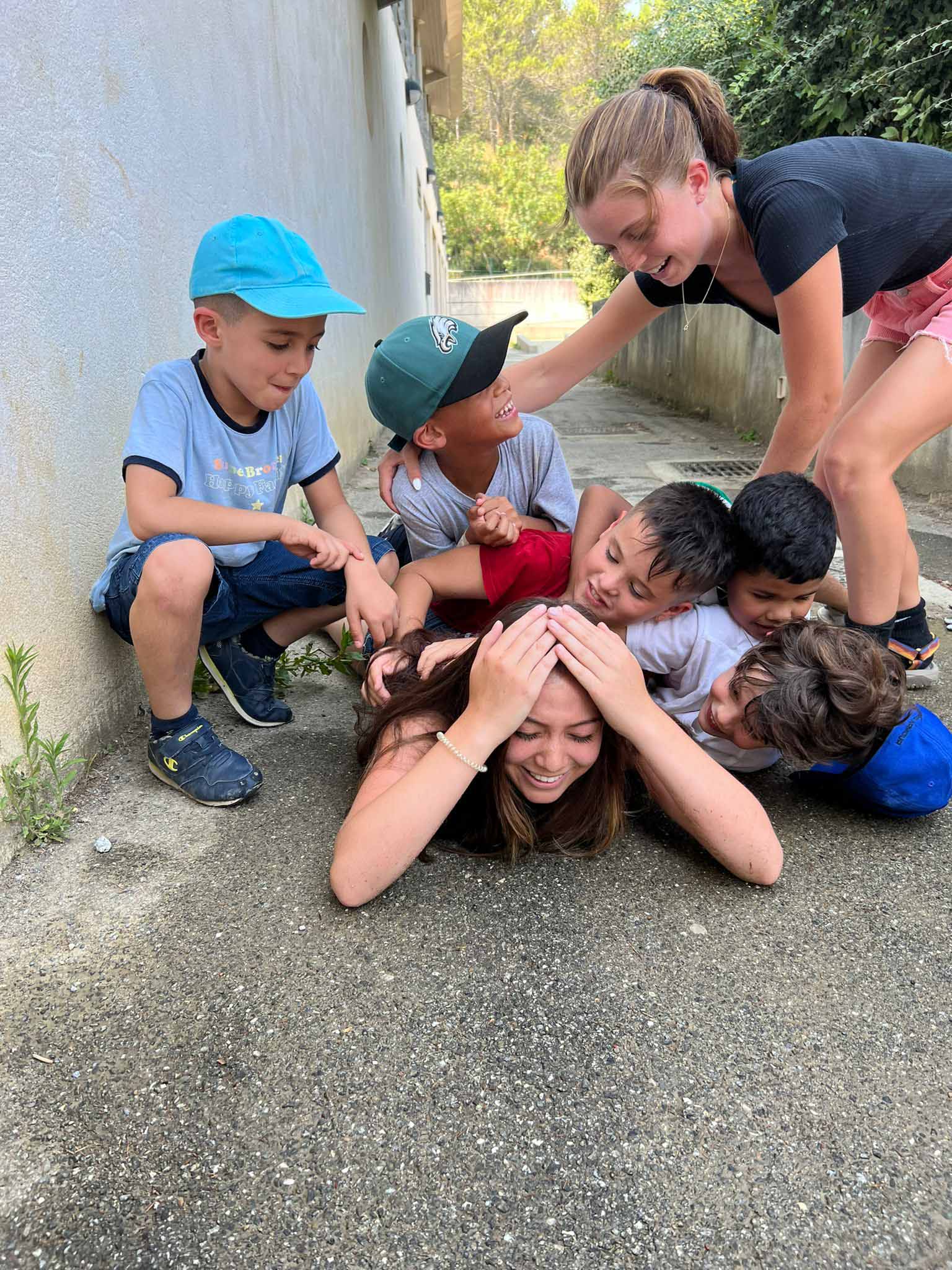A group of kids and a young woman are playing on the ground outside, with the kids piled on top of the woman—perhaps reminiscing during a joyful student trip to France—as she lies on the pavement, smiling.