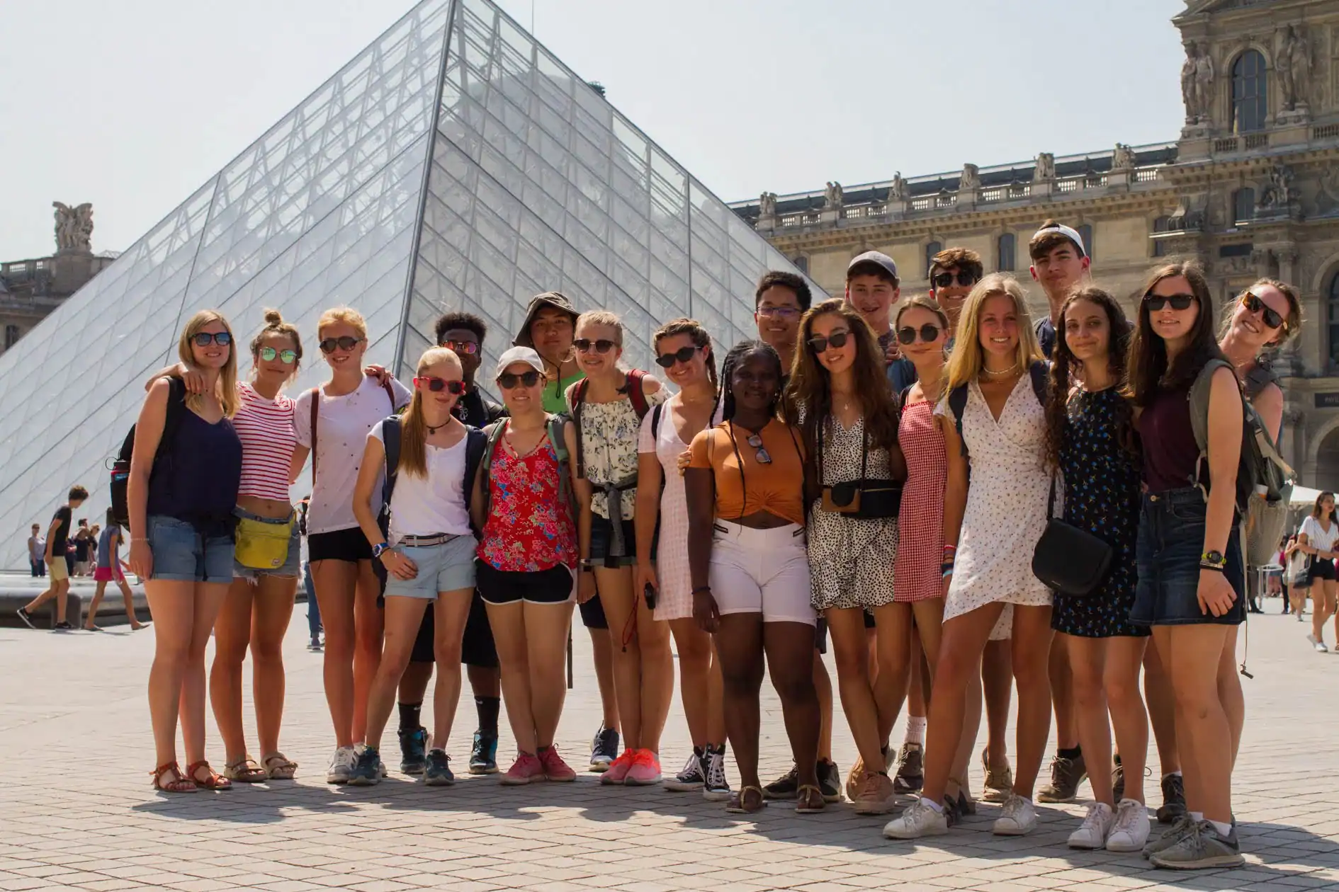 A group of young people on a student trip to France poses for a photo in front of the Louvre Pyramid in Paris on a sunny day.
