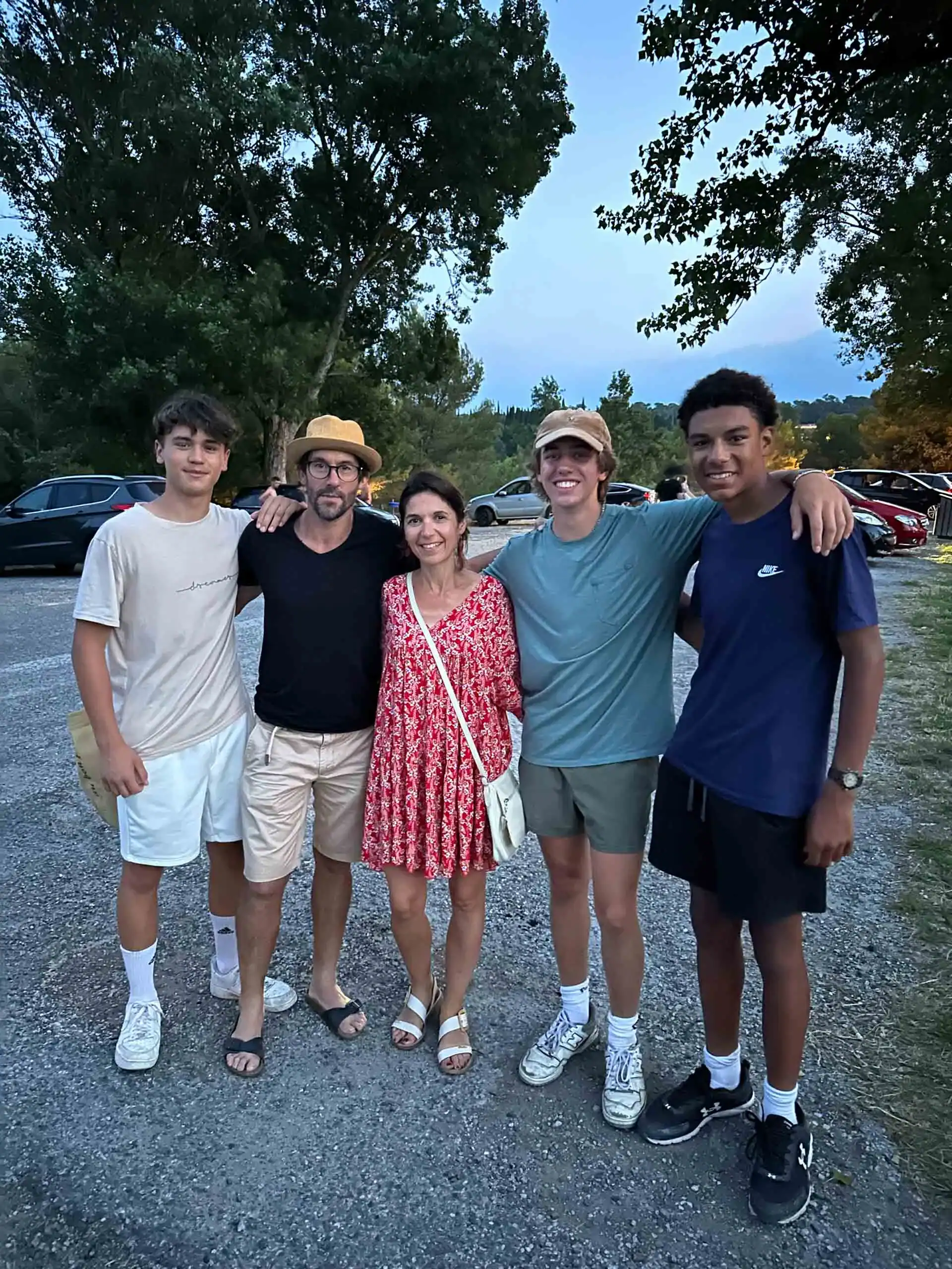 Five people stand together outdoors in a gravel parking lot during a homestay, posing for a photo during one of their French Immersion Teen Travel Programs. There are trees and parked cars in the background.
