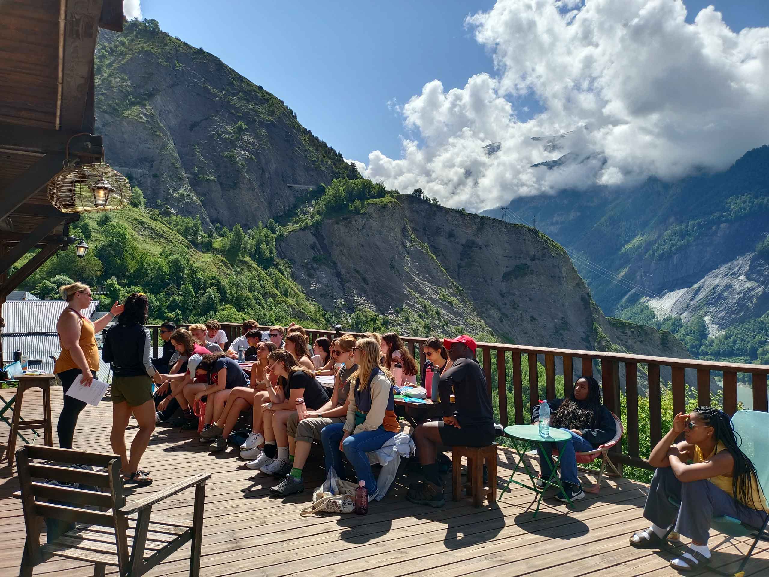 A group of people sitting and standing on a wooden deck overlooking a mountainous landscape under a partly cloudy sky.