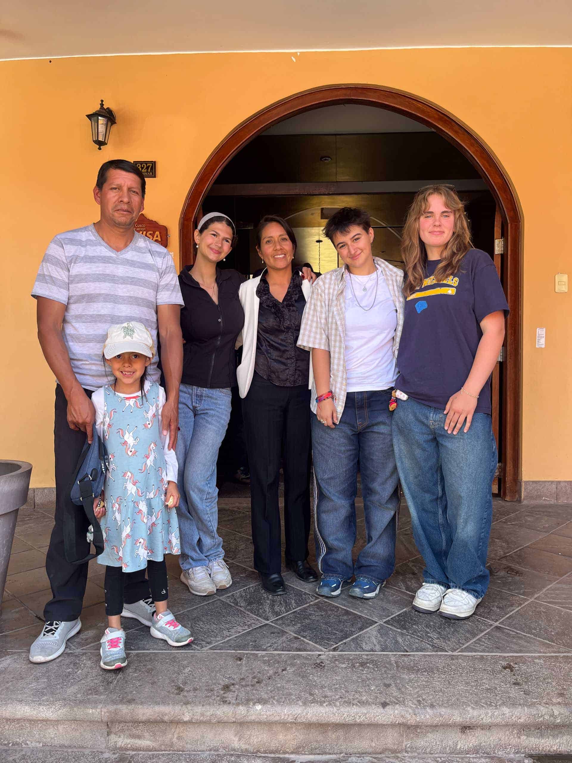 A group of six people, including two children, stand in front of an arched doorway. They are smiling and casually dressed.