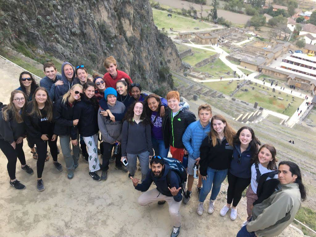 Group of people posing on a hill with a scenic archaeological site and landscape in the background.