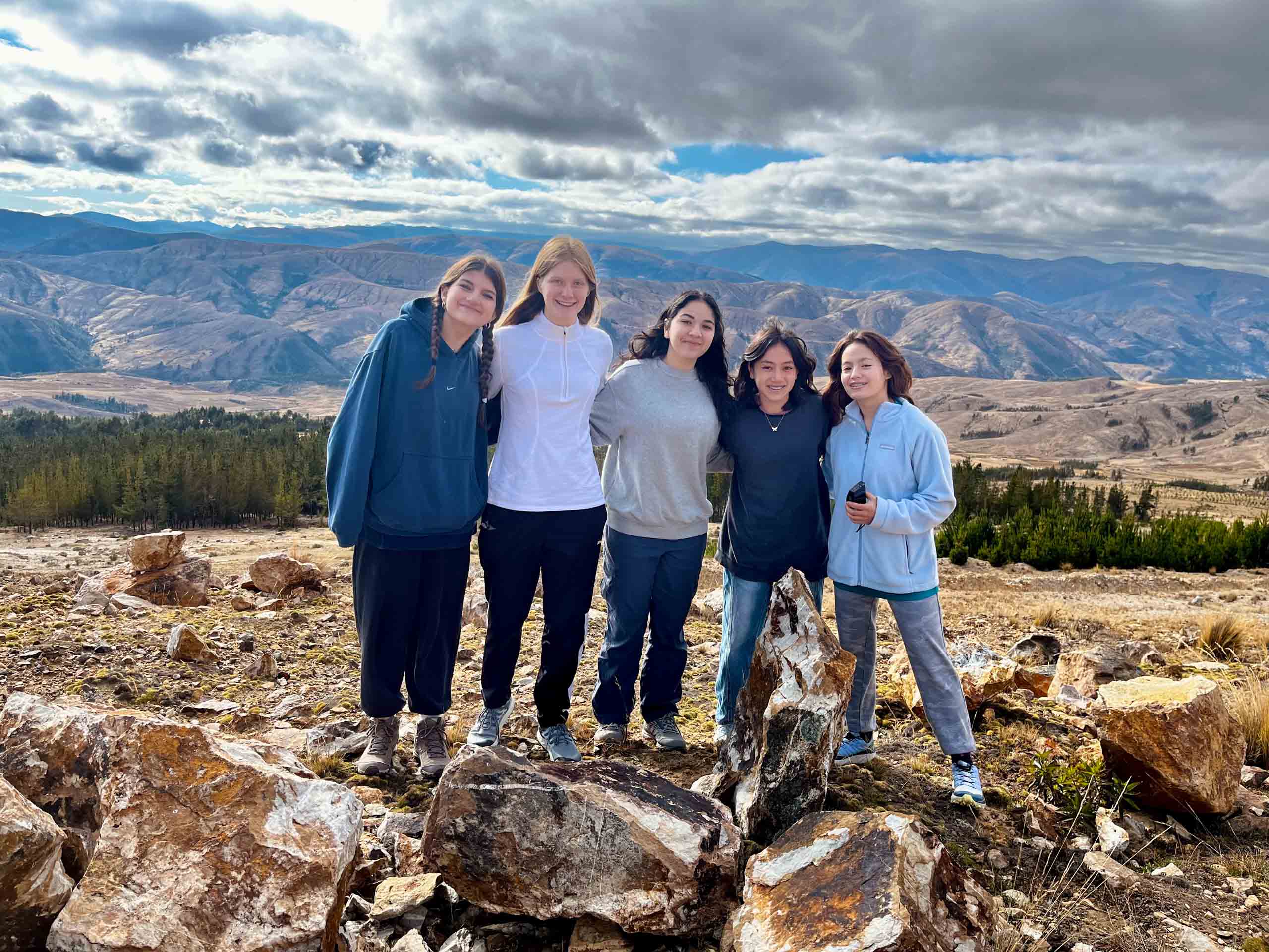 Five people standing together on a rocky hill with a mountainous landscape in the background under a cloudy sky.