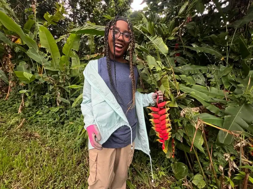 A student traveler standing outdoors in front of tropical plants, smiling and holding a hanging cluster of red and yellow flowers during student travel to Puerto Rico.