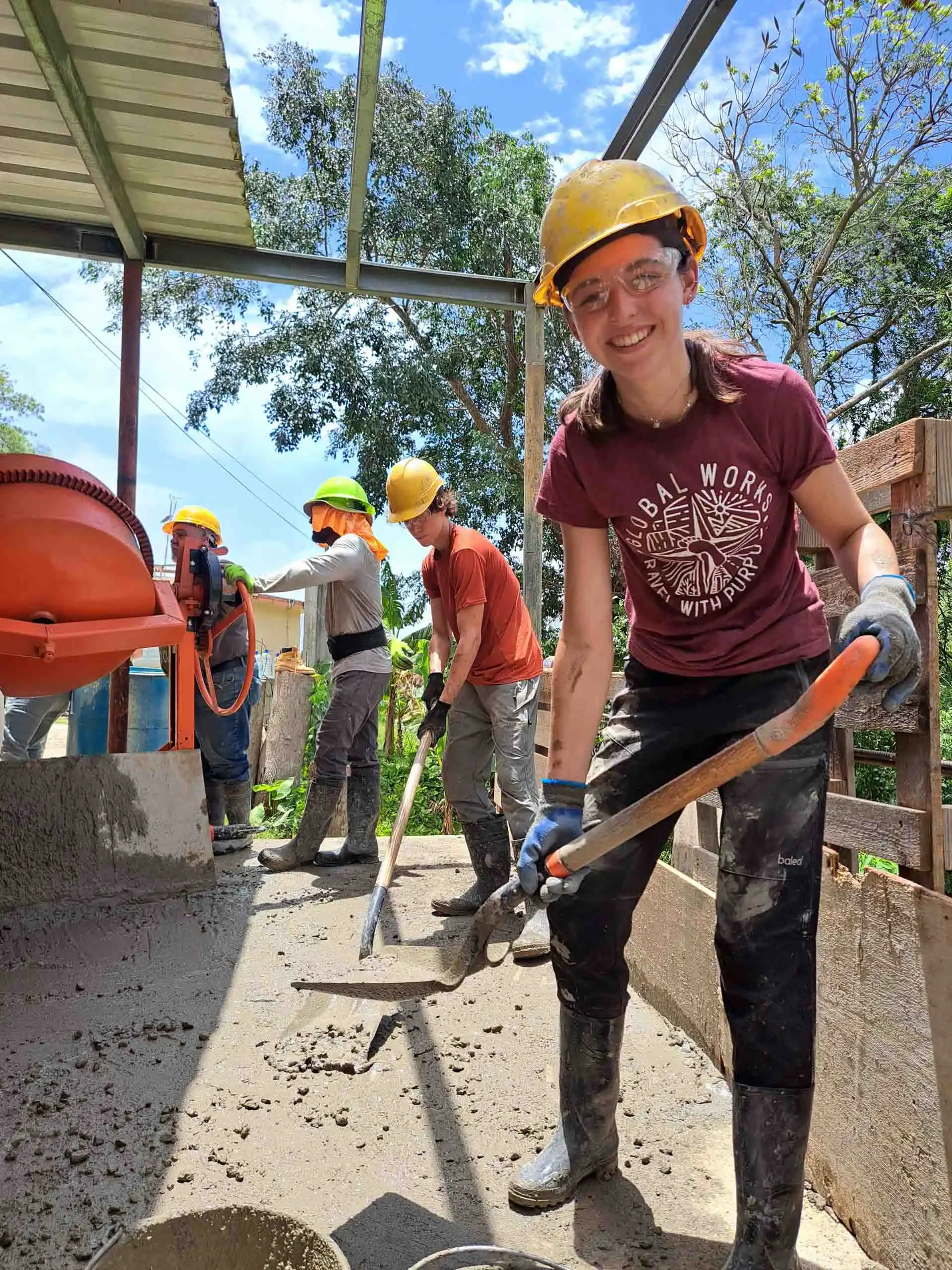 Four students wearing hard hats and work clothes mix and spread cement outdoors during a service trip for teens by Global Works. One person in the foreground smiles while holding a shovel.