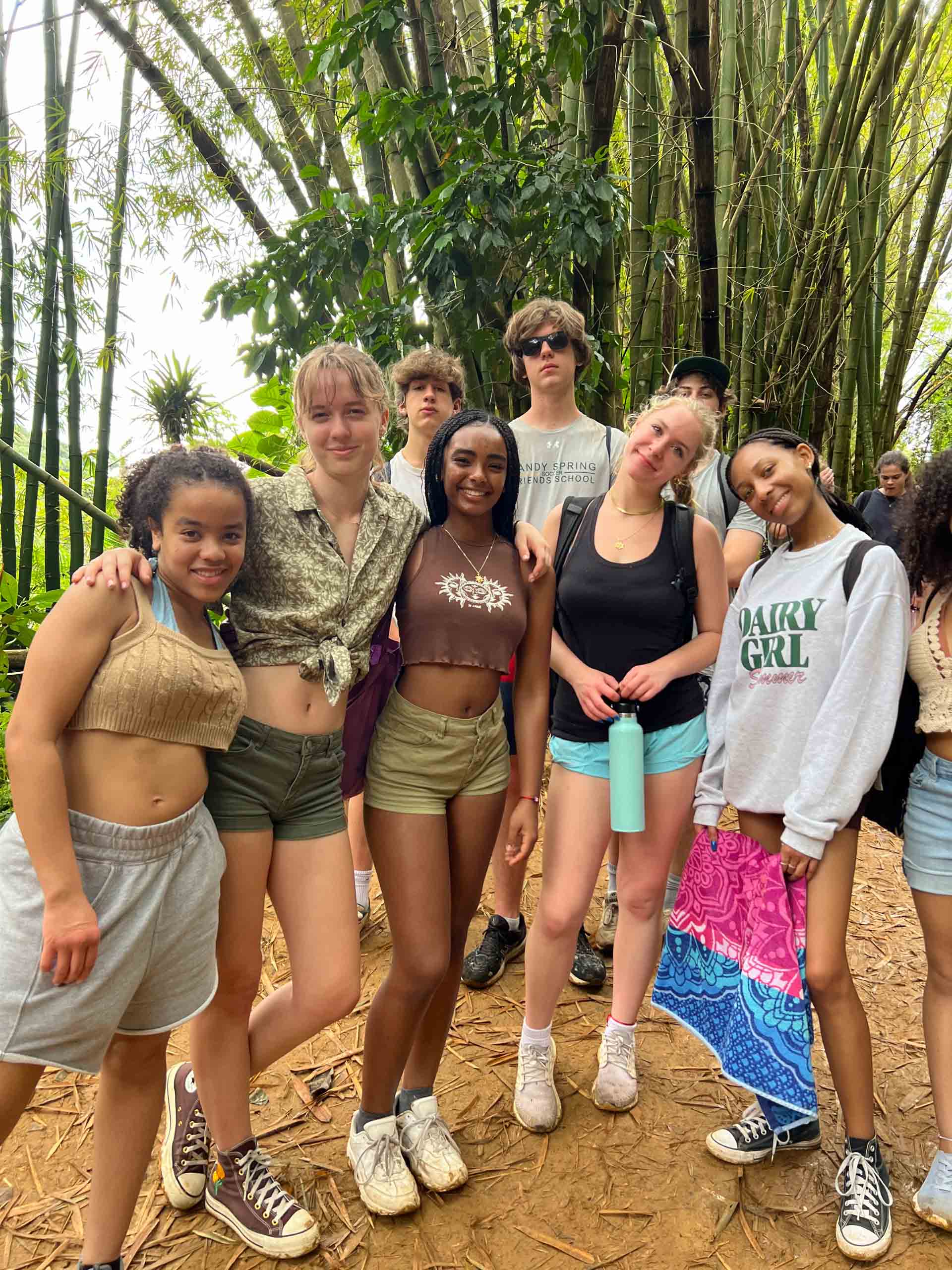 A group of smiling young adults in casual summer clothing stand together outdoors in a bamboo grove.