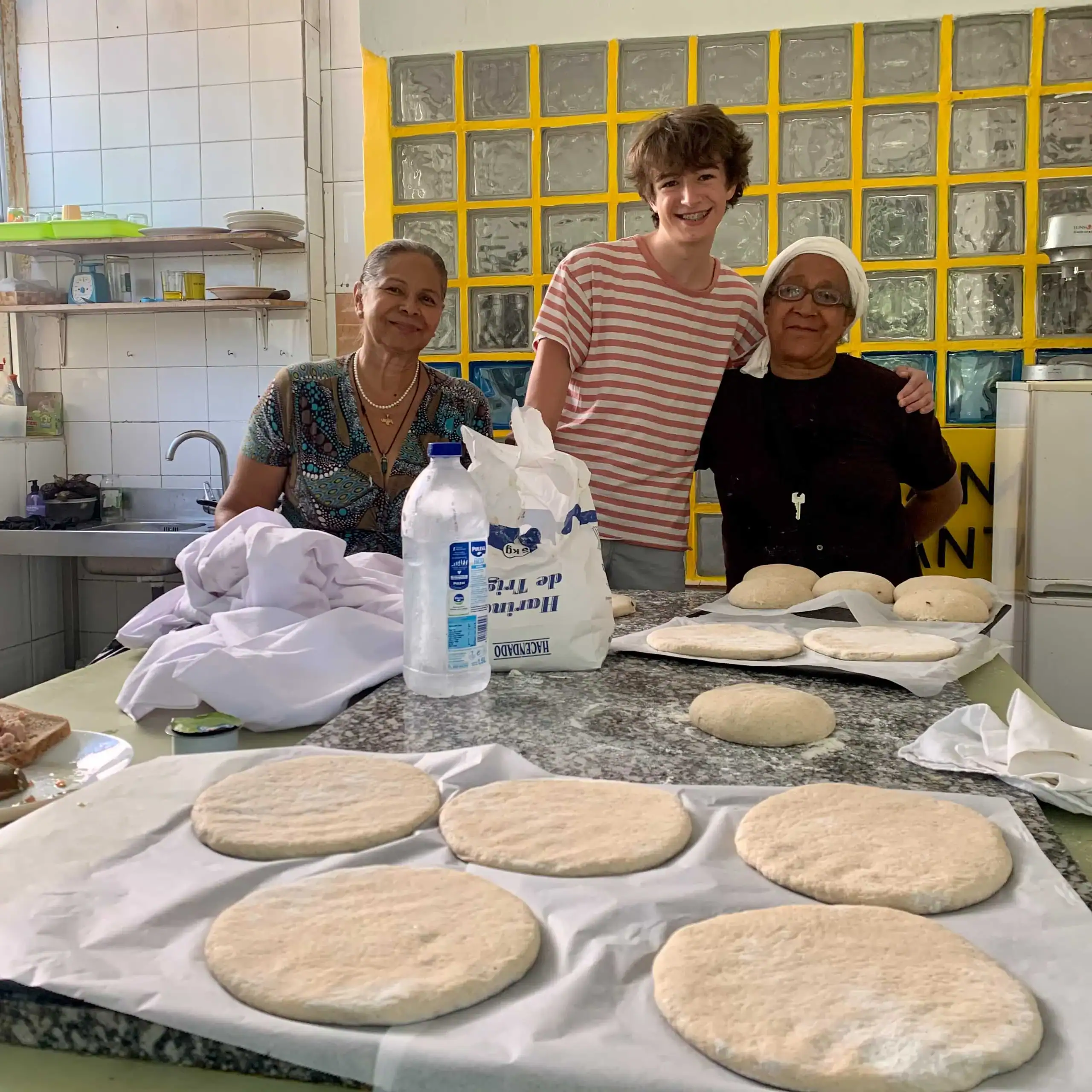 Three people stand in a kitchen behind a counter with dough rounds on baking sheets, preparing bread during their Spanish immersion program.