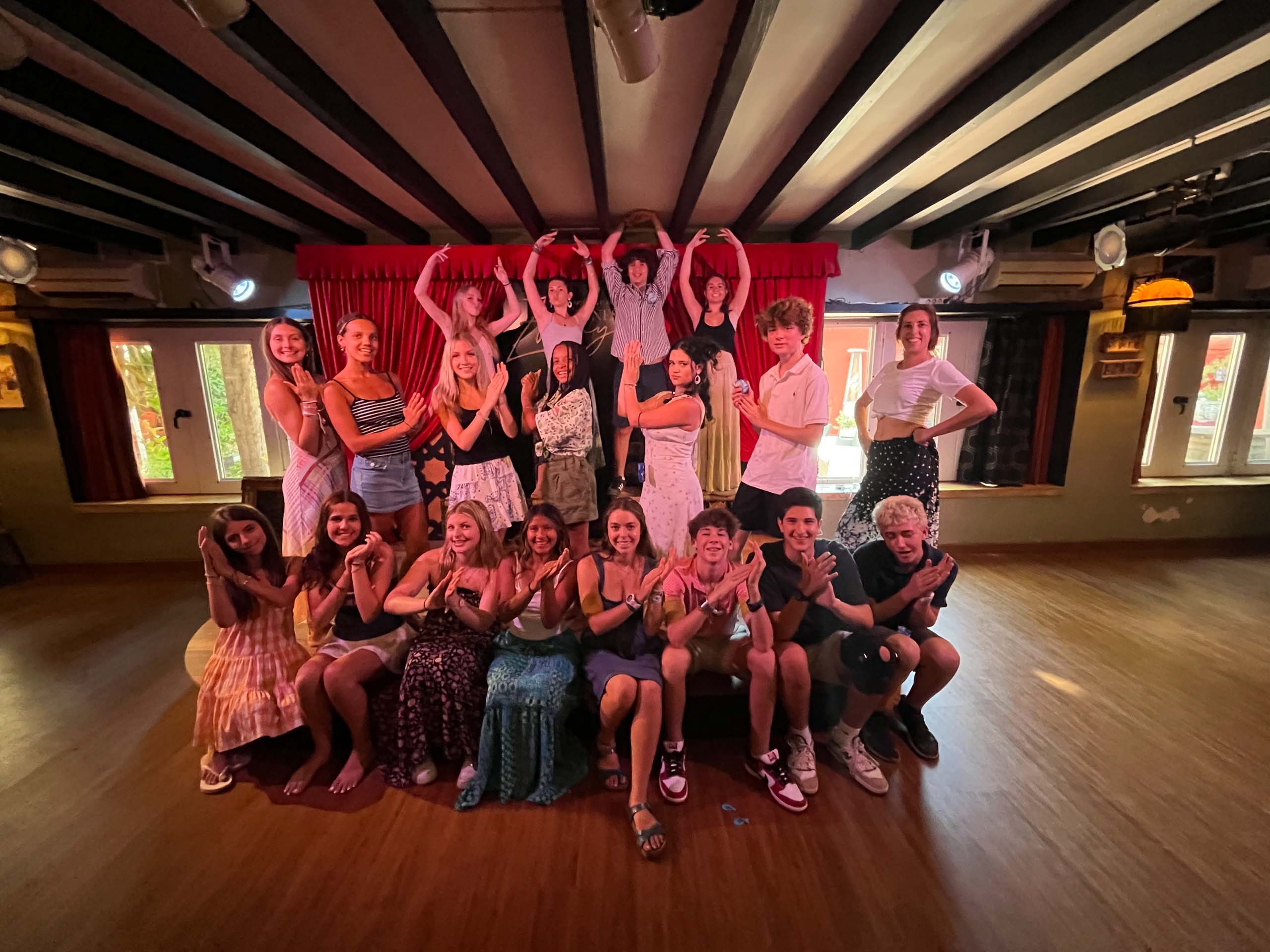 A group of people posing indoors, some standing and making gestures while others are seated, in a warmly lit room with wooden beams and red curtains.