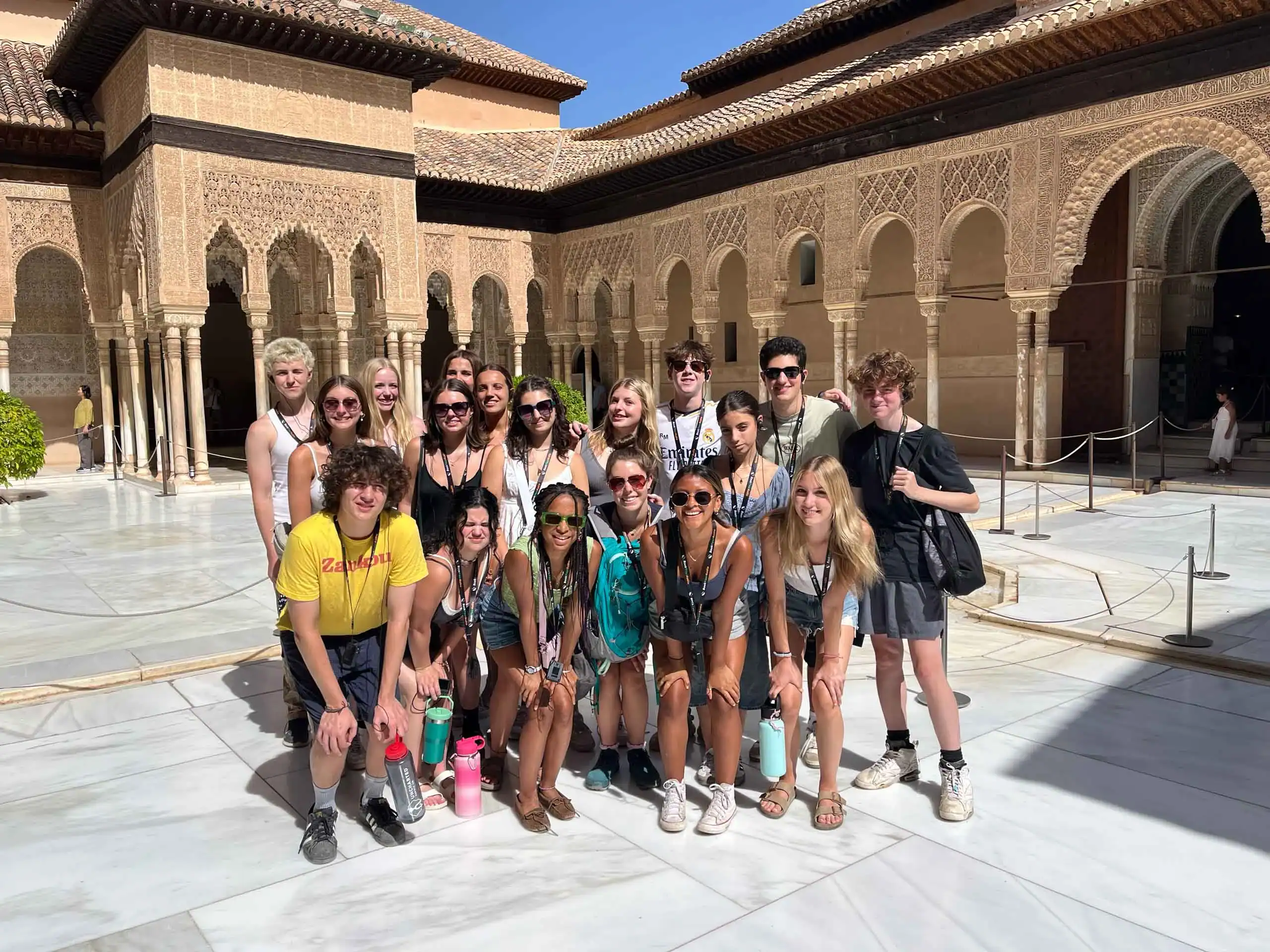 A group of people posing for a photo in a sunny courtyard with intricate architectural details in the background.