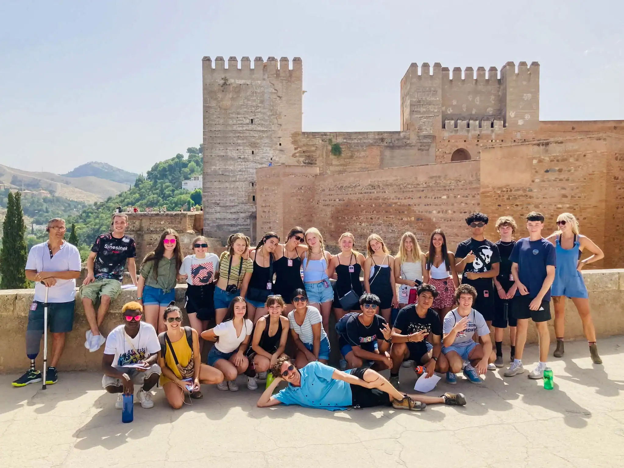 A large group of young people in a Spanish immersion program to Spain pose together in front of ancient stone walls and towers on a sunny day, with mountains visible in the background.