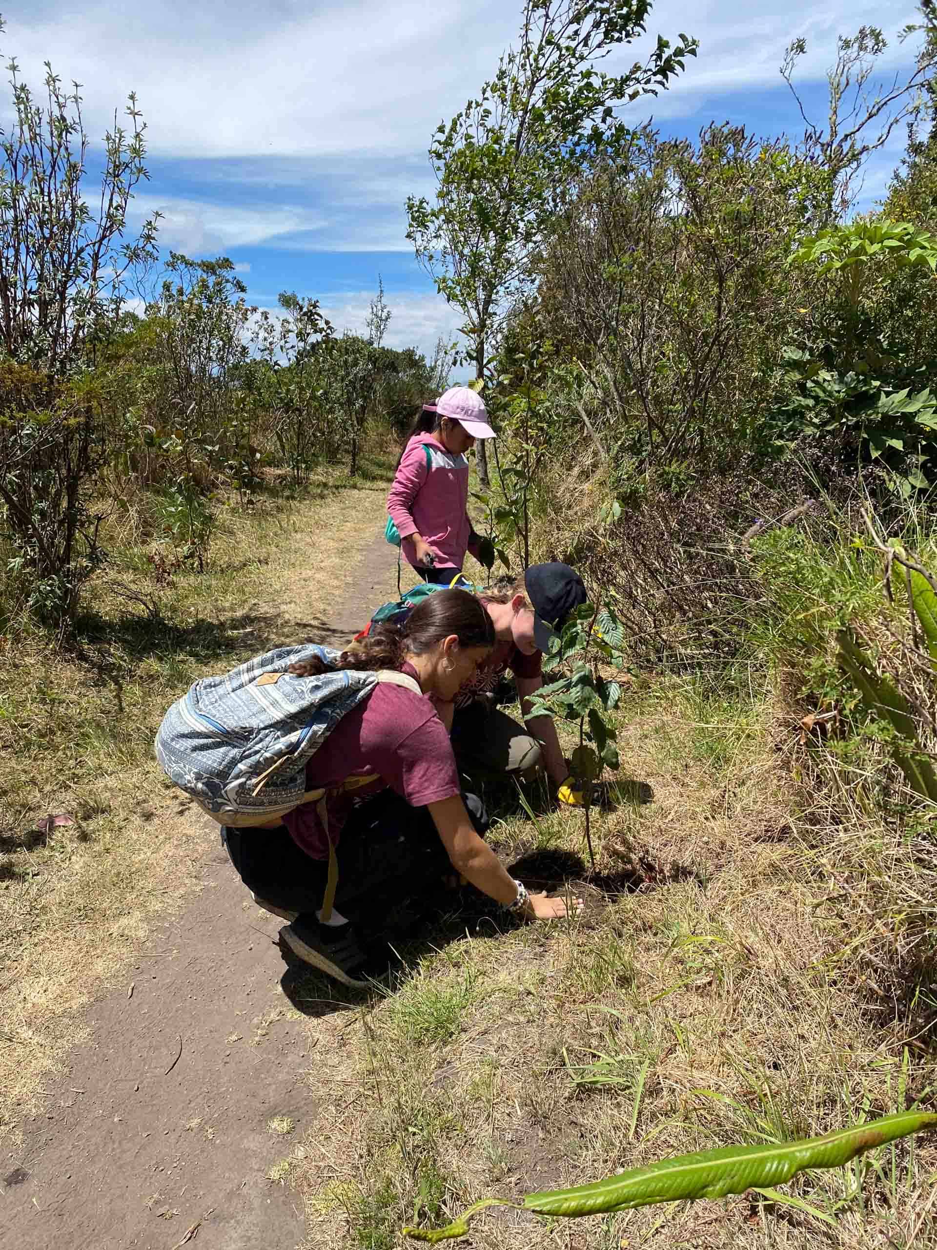 Three people planting a small tree in a grassy area on a sunny day, surrounded by bushes and trees.