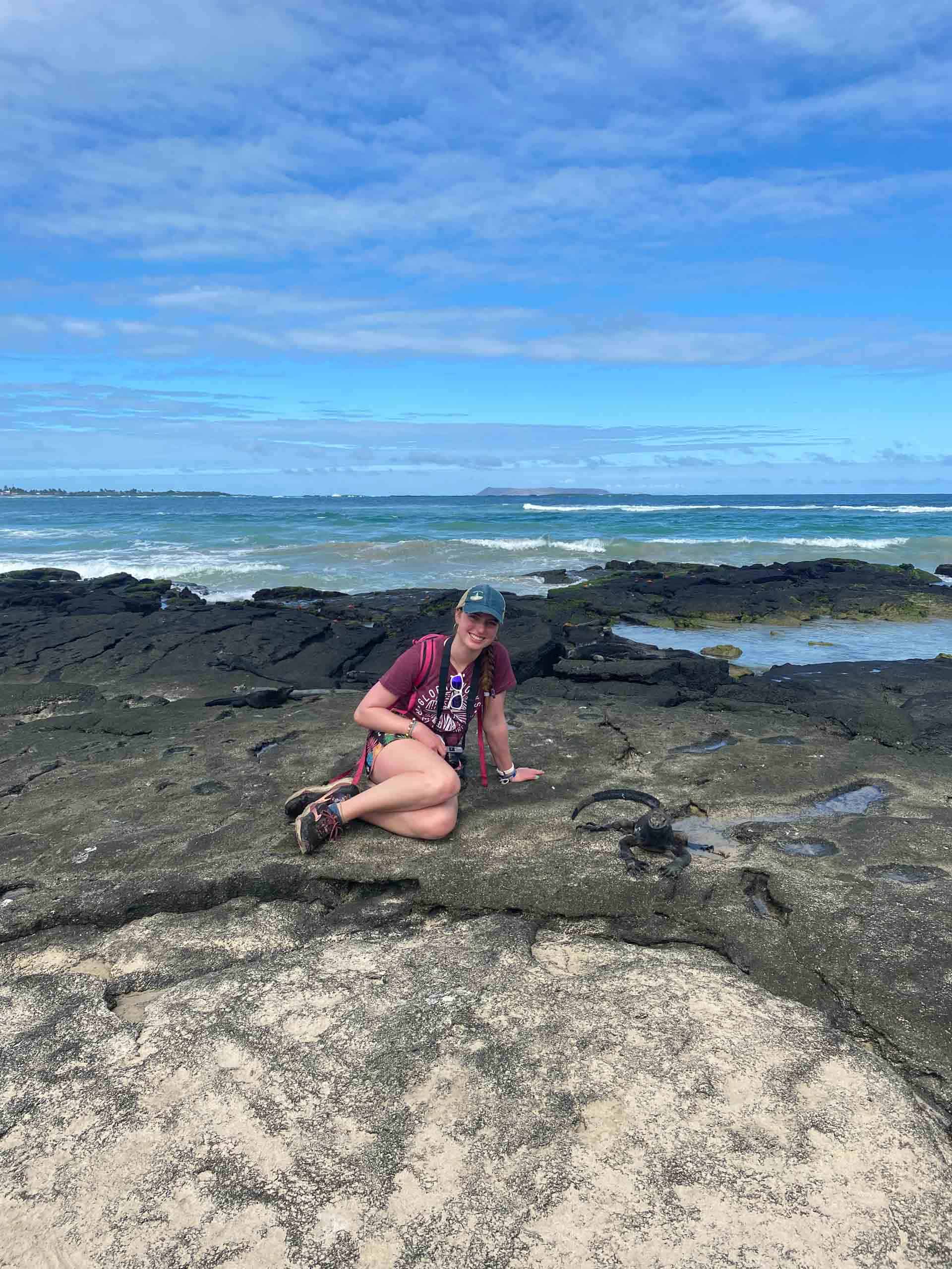 Person sitting on rocky shore near the ocean on a partly cloudy day.