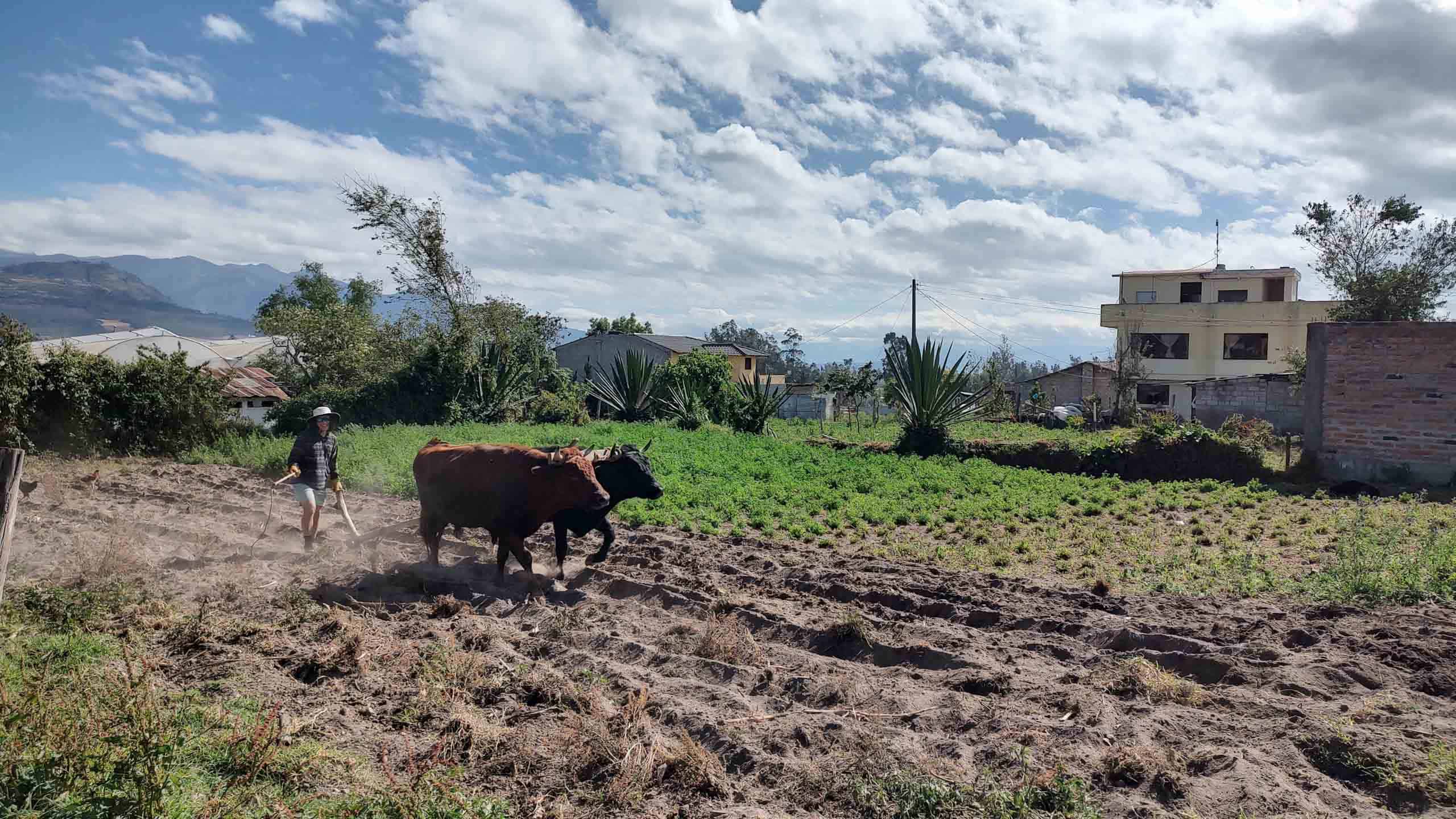 A person plows a field with two oxen under a partly cloudy sky in a rural area.