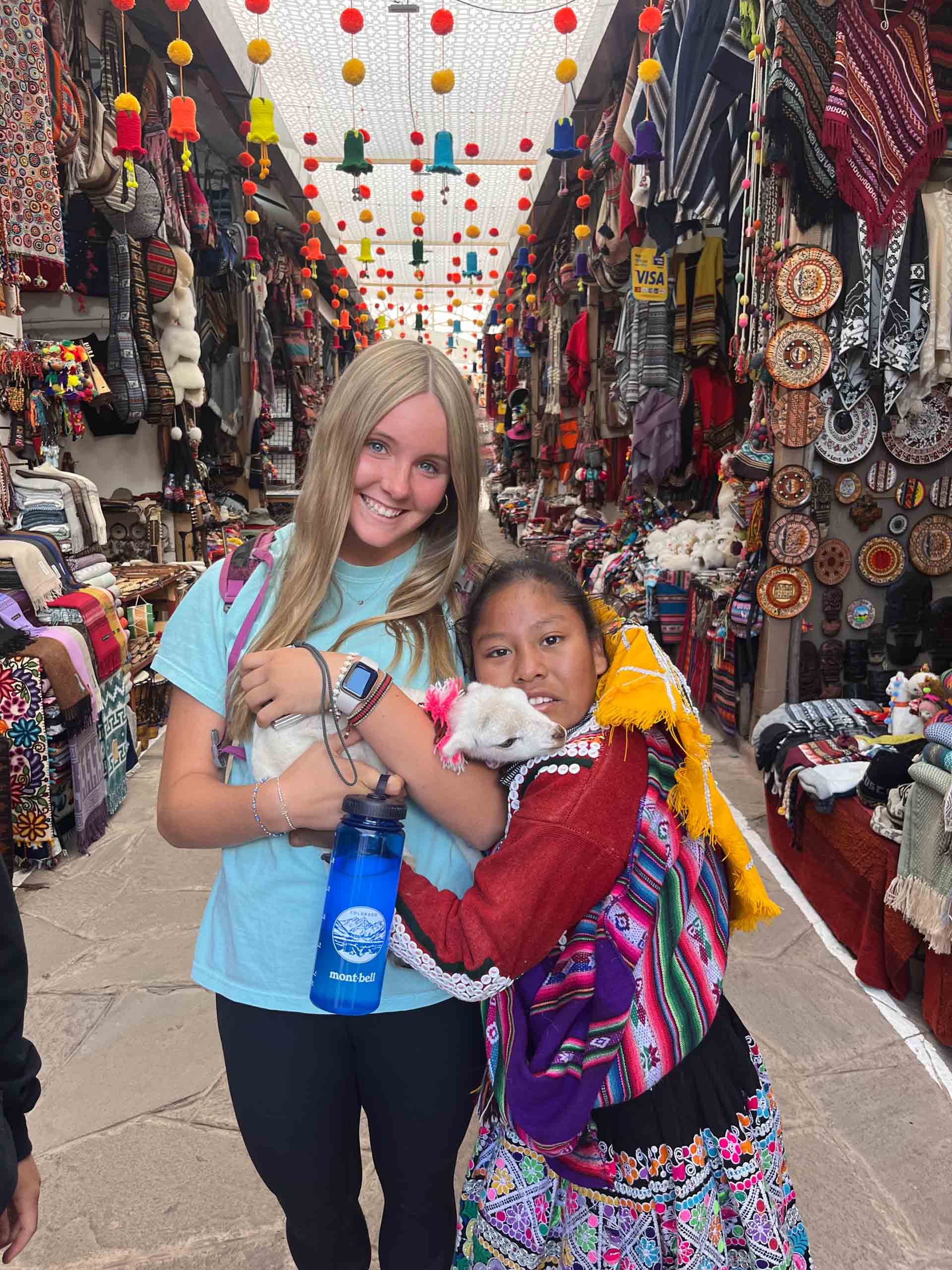 Two people stand in a busy market filled with colorful textiles and crafts. One holds a white animal, and the other is smiling. Bright decorations hang from the ceiling.