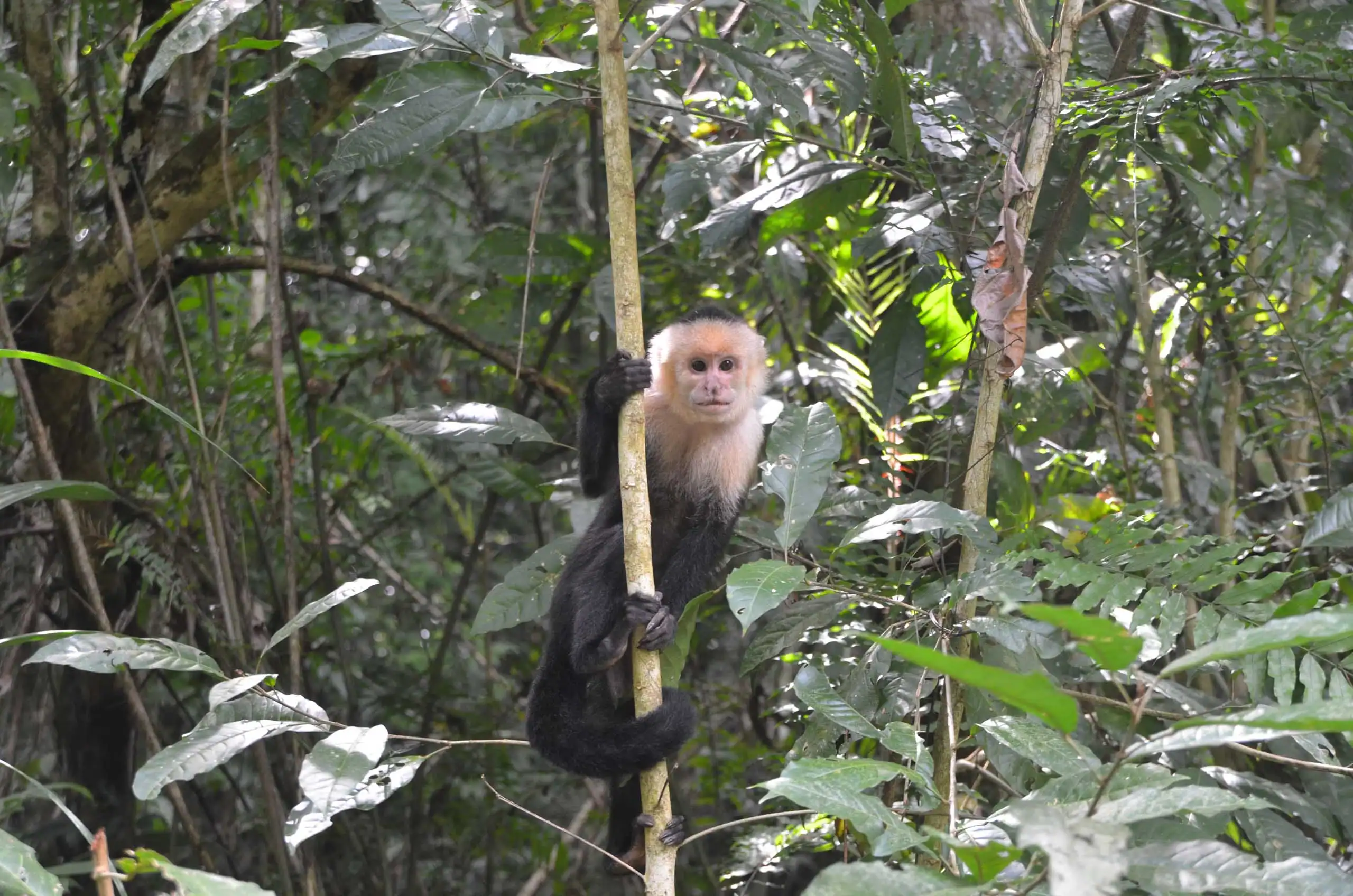 A capuchin monkey clings to a vine, surrounded by dense green foliage in a forest setting. Wildlife preservation and conversation is part of our teen travel programs.