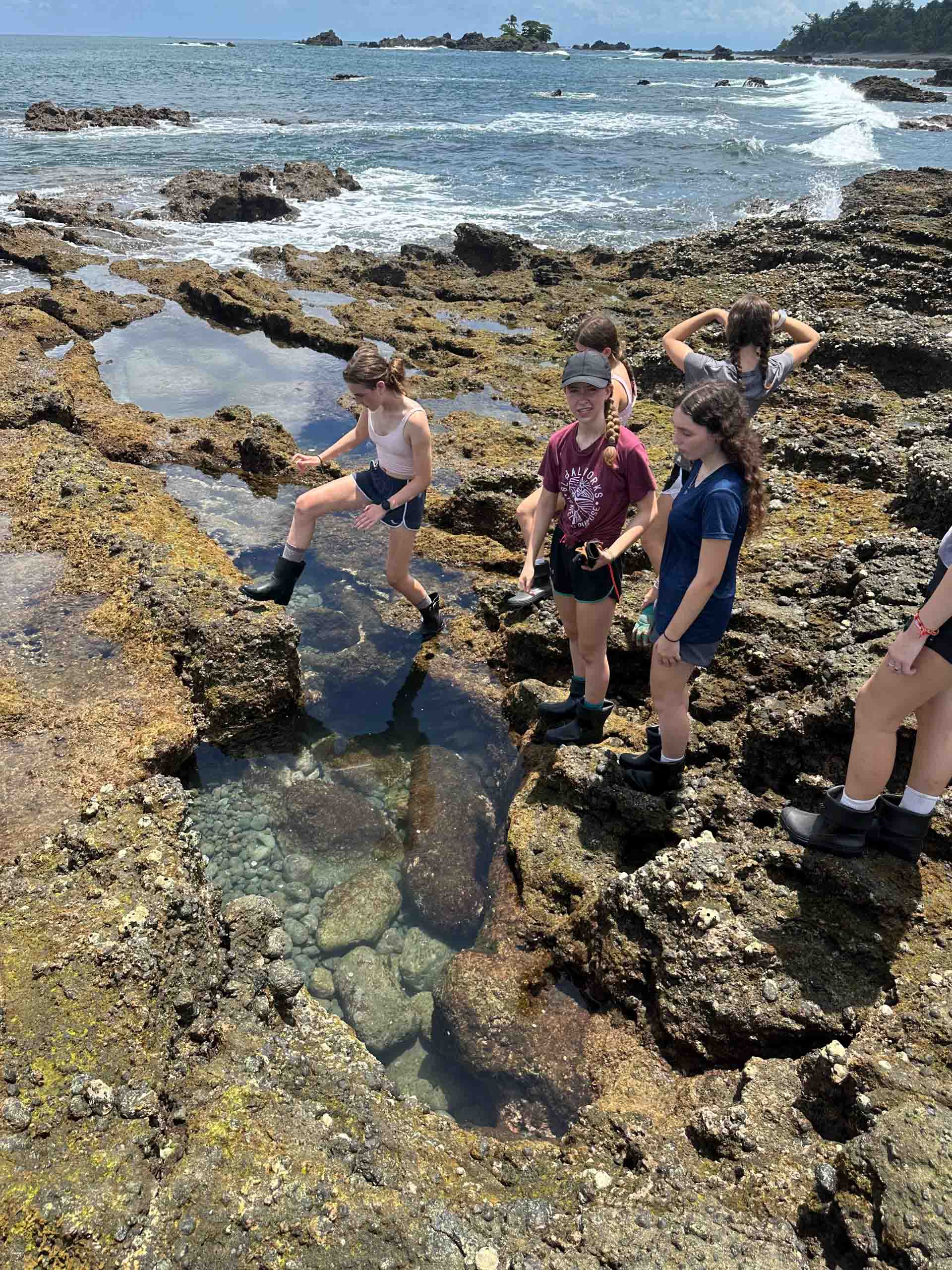 A group of people explore a rocky tide pool by the ocean, wearing shorts and boots.