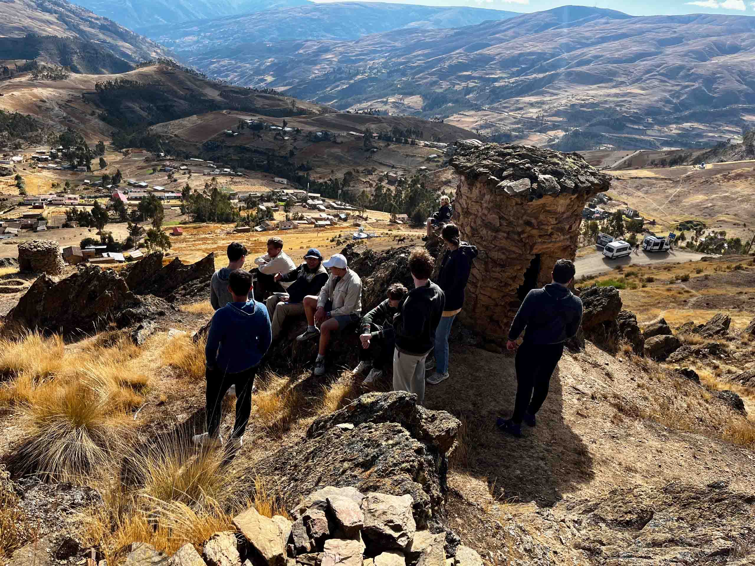 A group of people gather on a rocky hill with a scenic view of a village and mountains in the background.