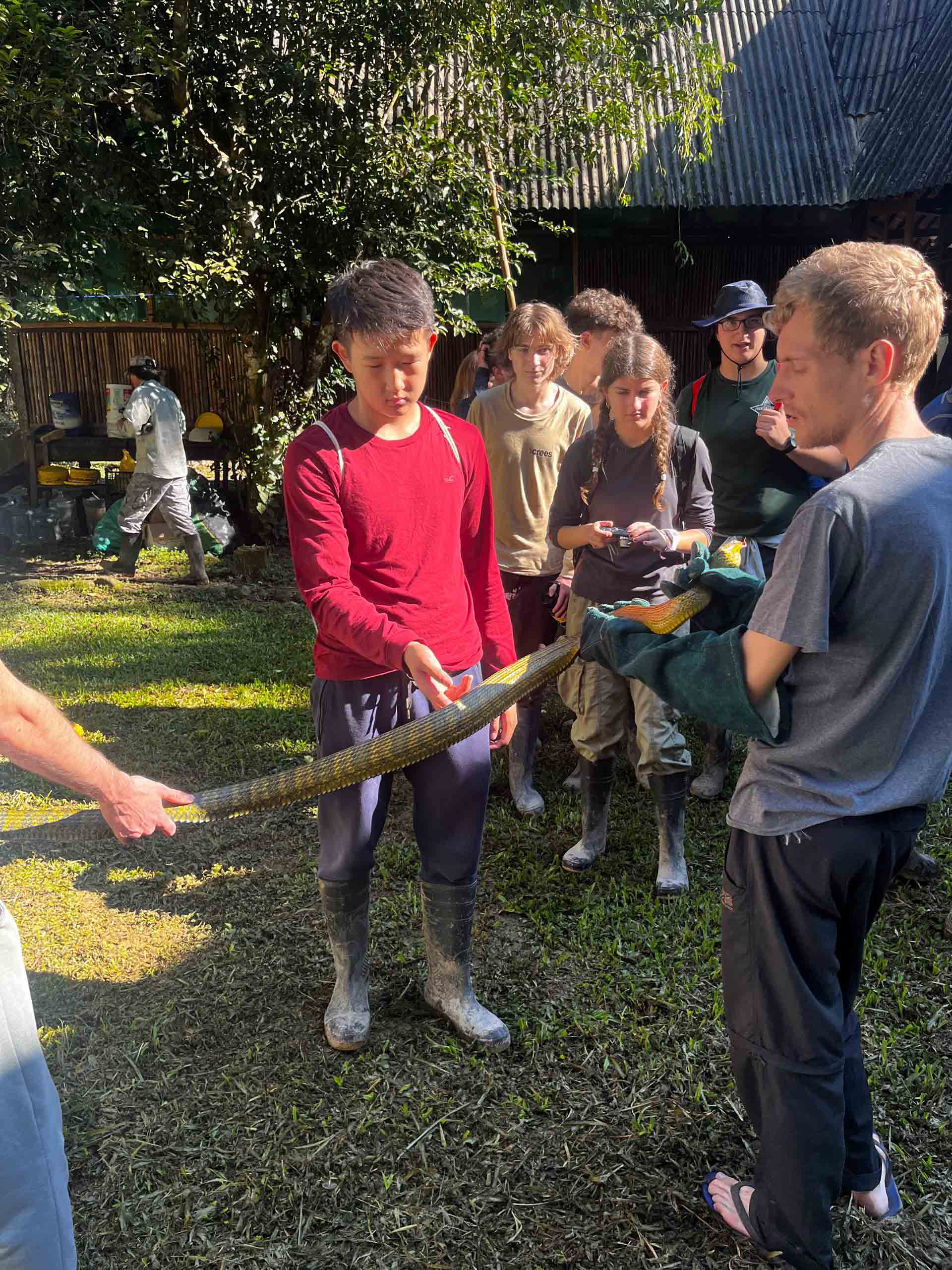 A group of people stands outdoors examining a large snake held by two individuals. They're surrounded by greenery and wearing casual outdoor attire.