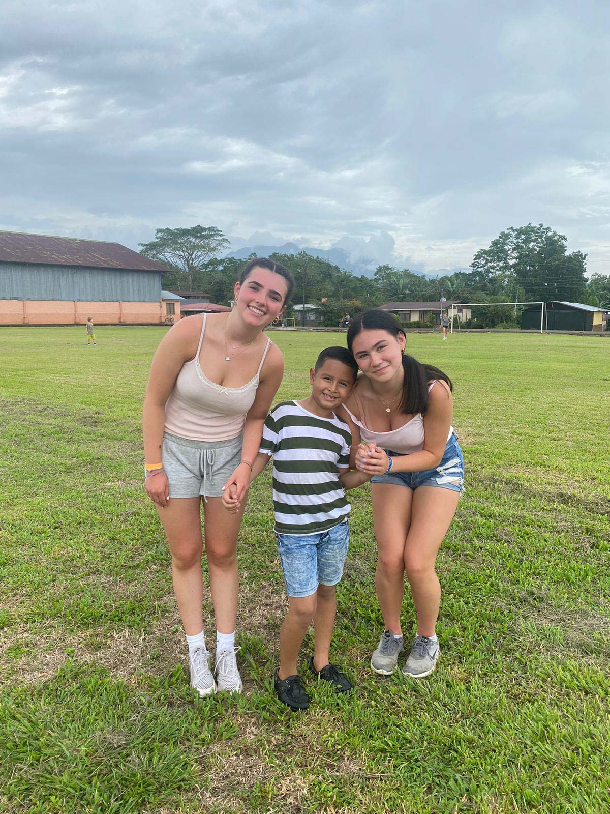 Two women and a boy smiling and posing together on a grassy field with a building and trees in the background.