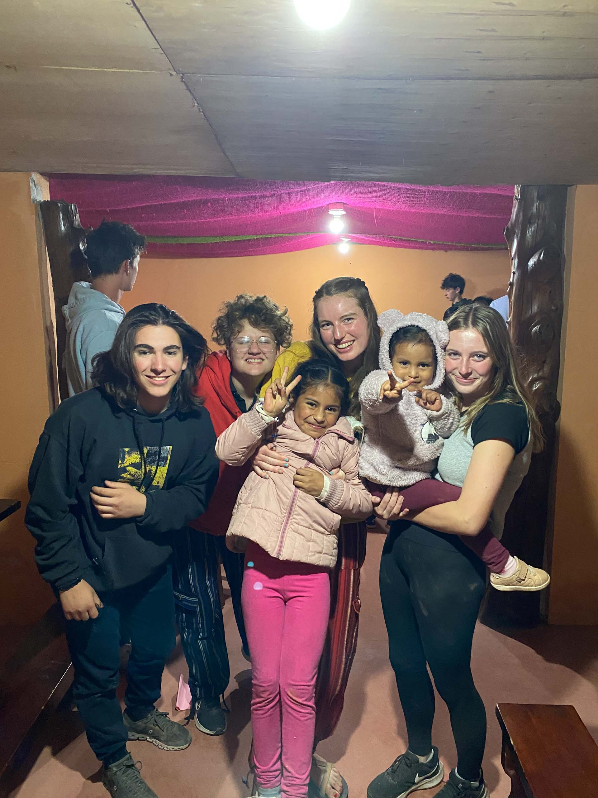 A group of people, including three adults and three children, pose and smile for a photo indoors with wooden pillars and warm lighting.