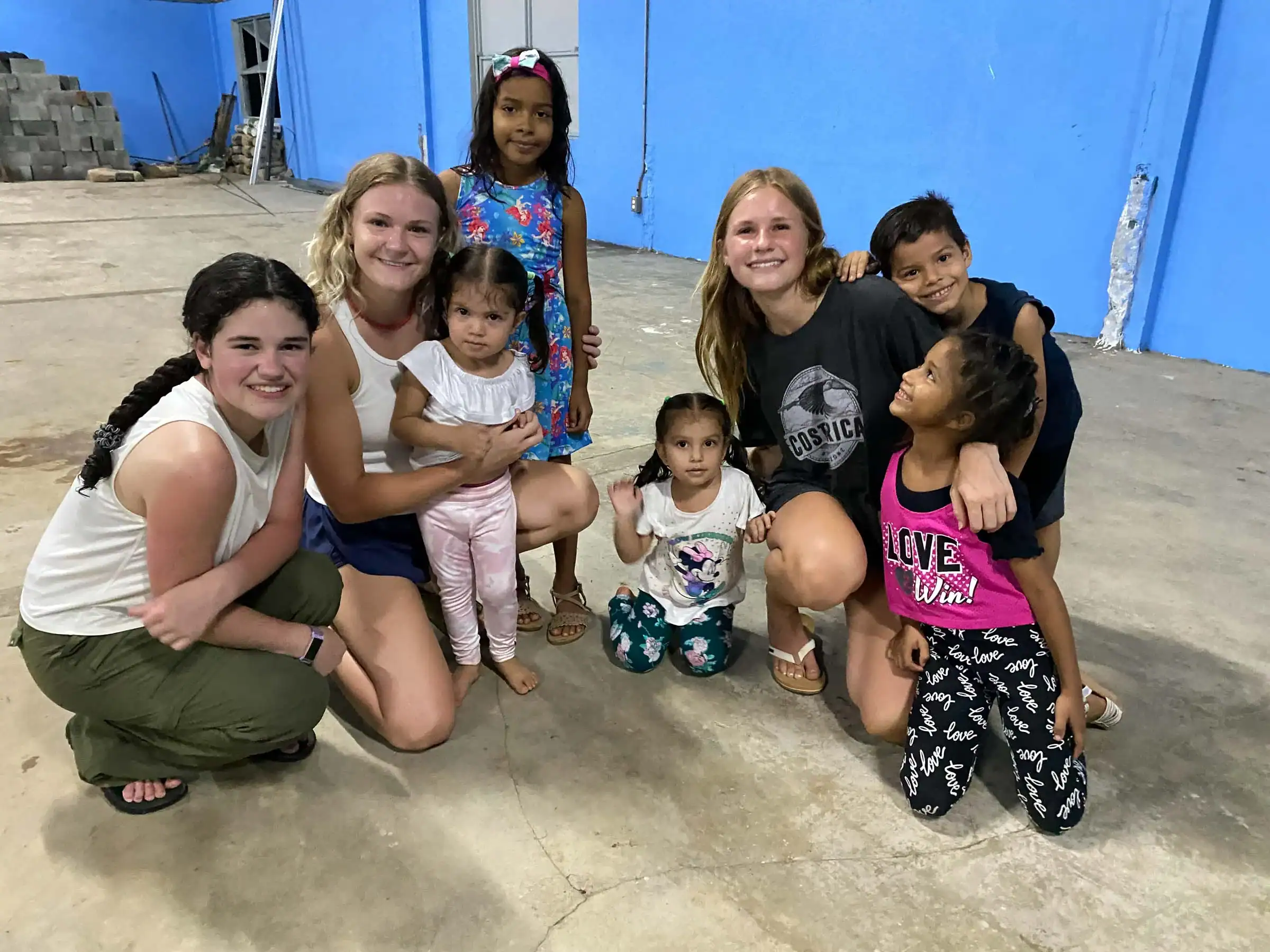 Three young women and five young children pose together, smiling, in a large indoor space with blue walls and a concrete floor—capturing the spirit of teen programs that work with kids.