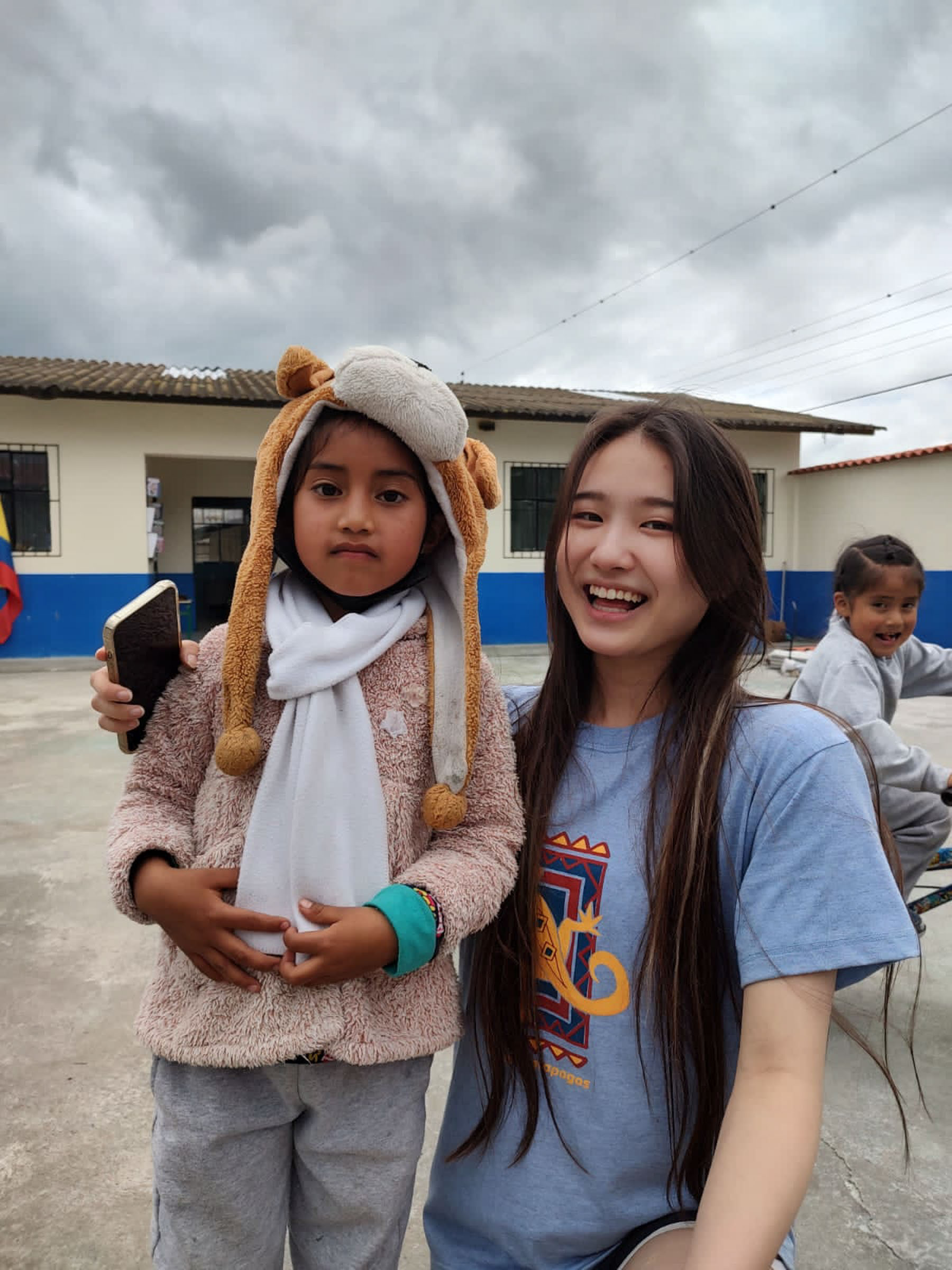 A child wearing a monkey hat stands with a smiling young woman outdoors. Another child is in the background.