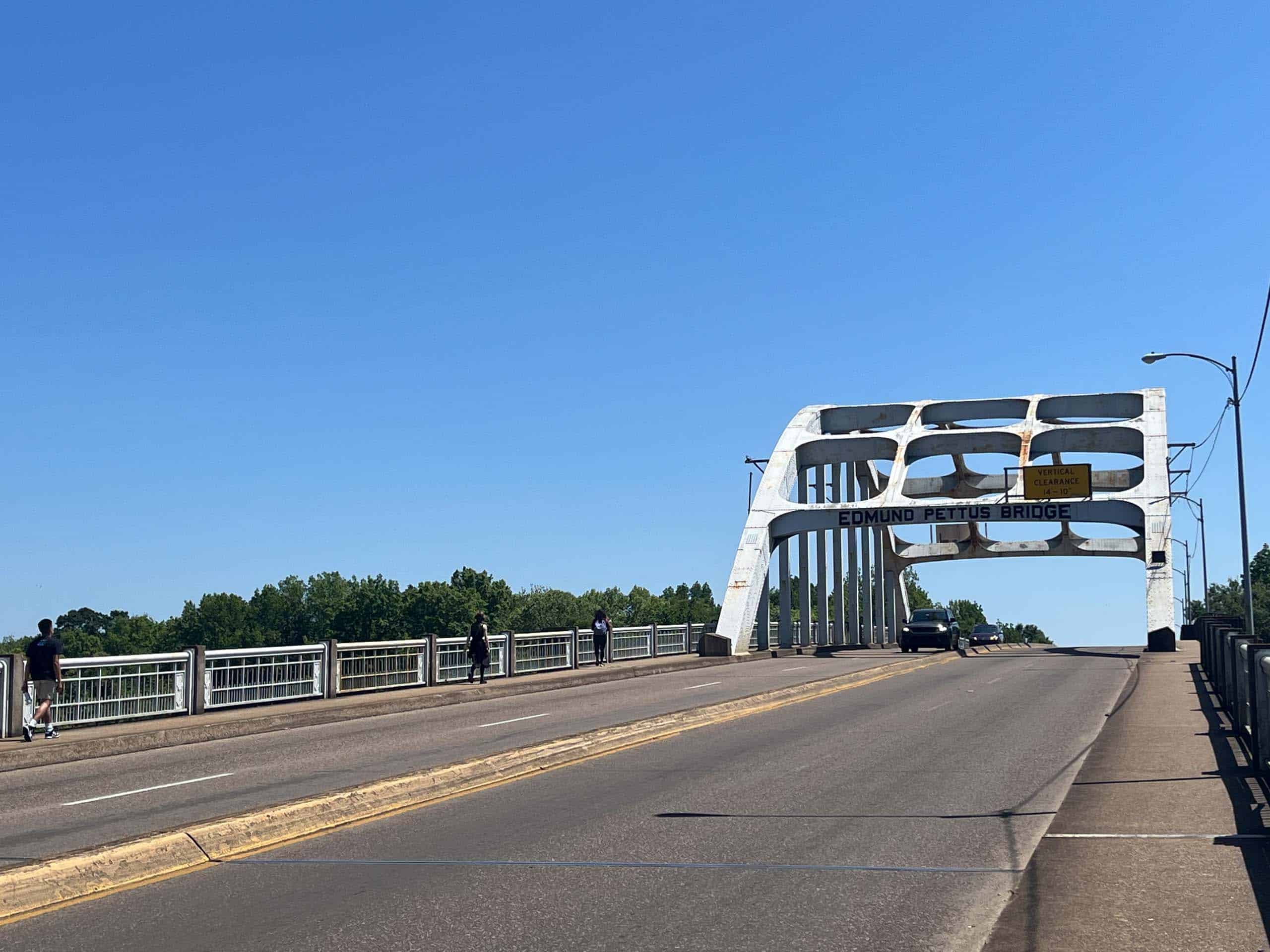 Edmund Pettus Bridge spans a clear blue sky with pedestrians on the walkway and a car driving across.
