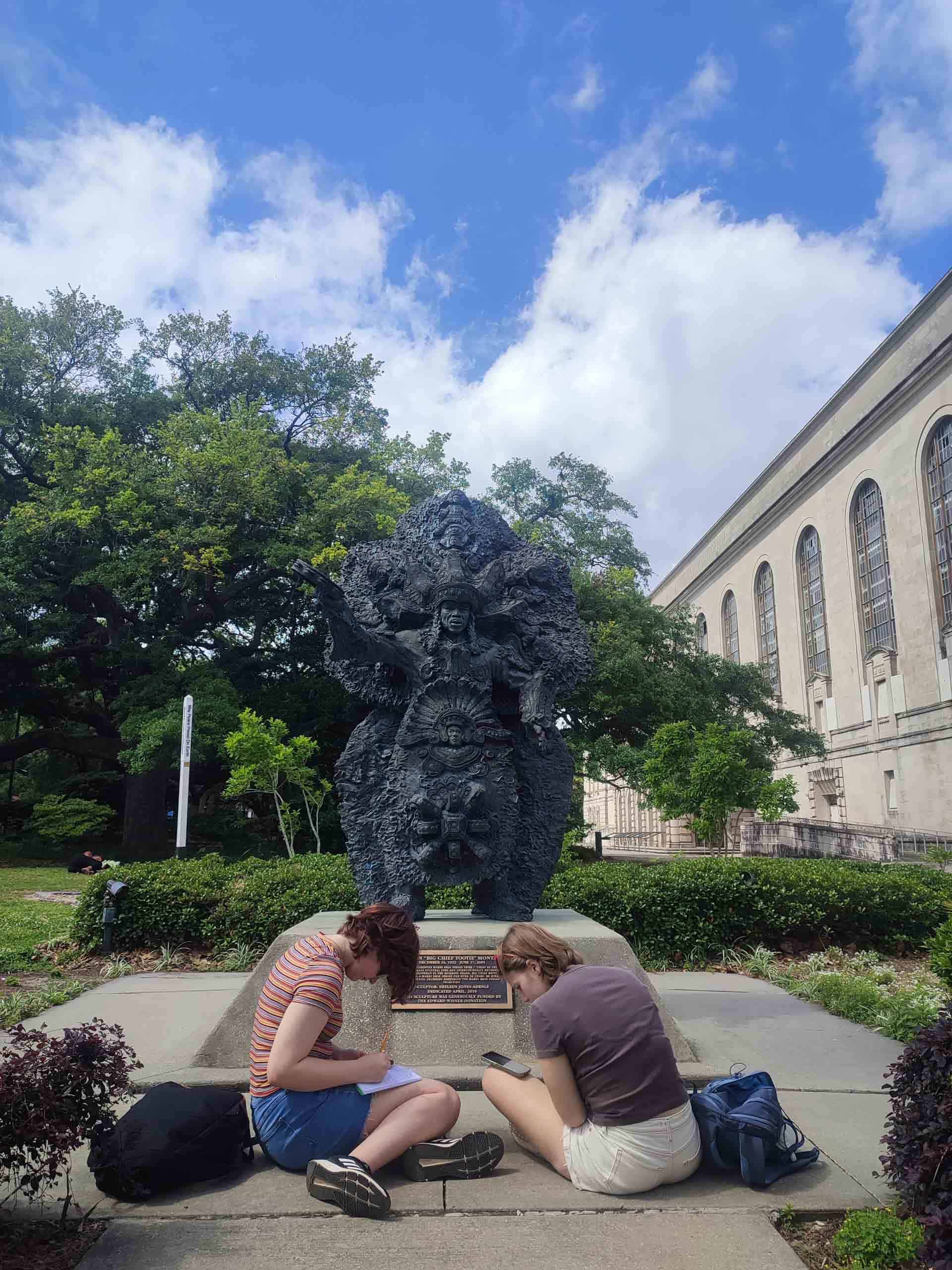Two people sitting on a sidewalk, sketching a large, intricate statue situated in a green garden with trees and a building in the background.