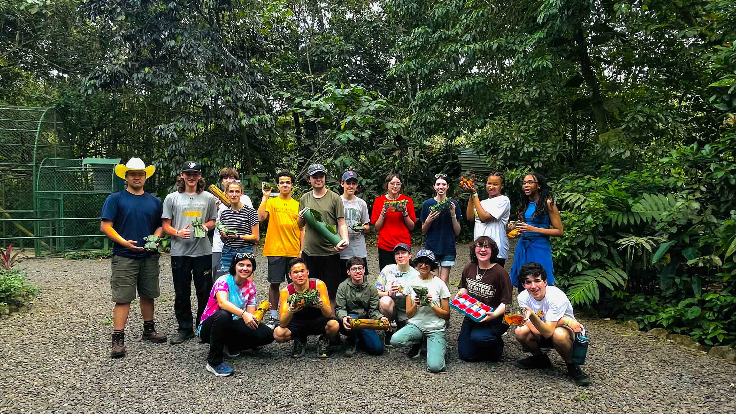 A group of people stands outdoors on gravel, surrounded by greenery. Some hold small items or plants.