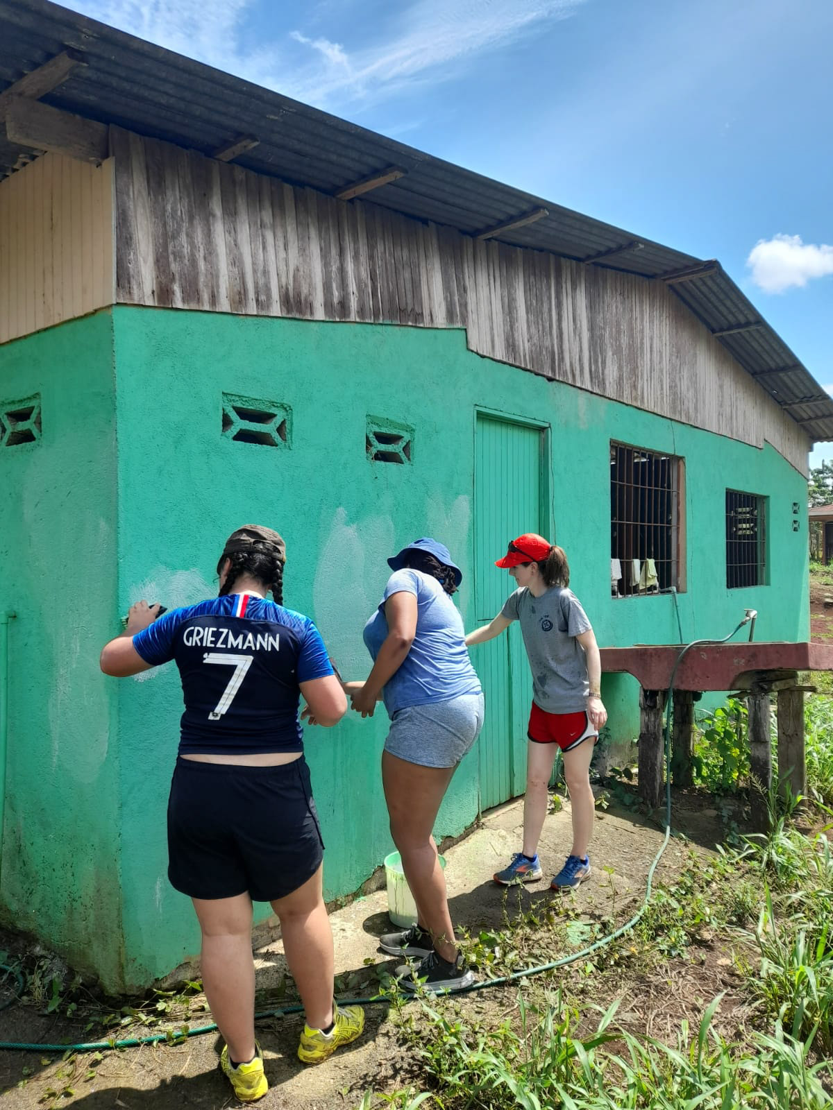 Three people repaint a green exterior wall of a building on stilts under a clear sky.