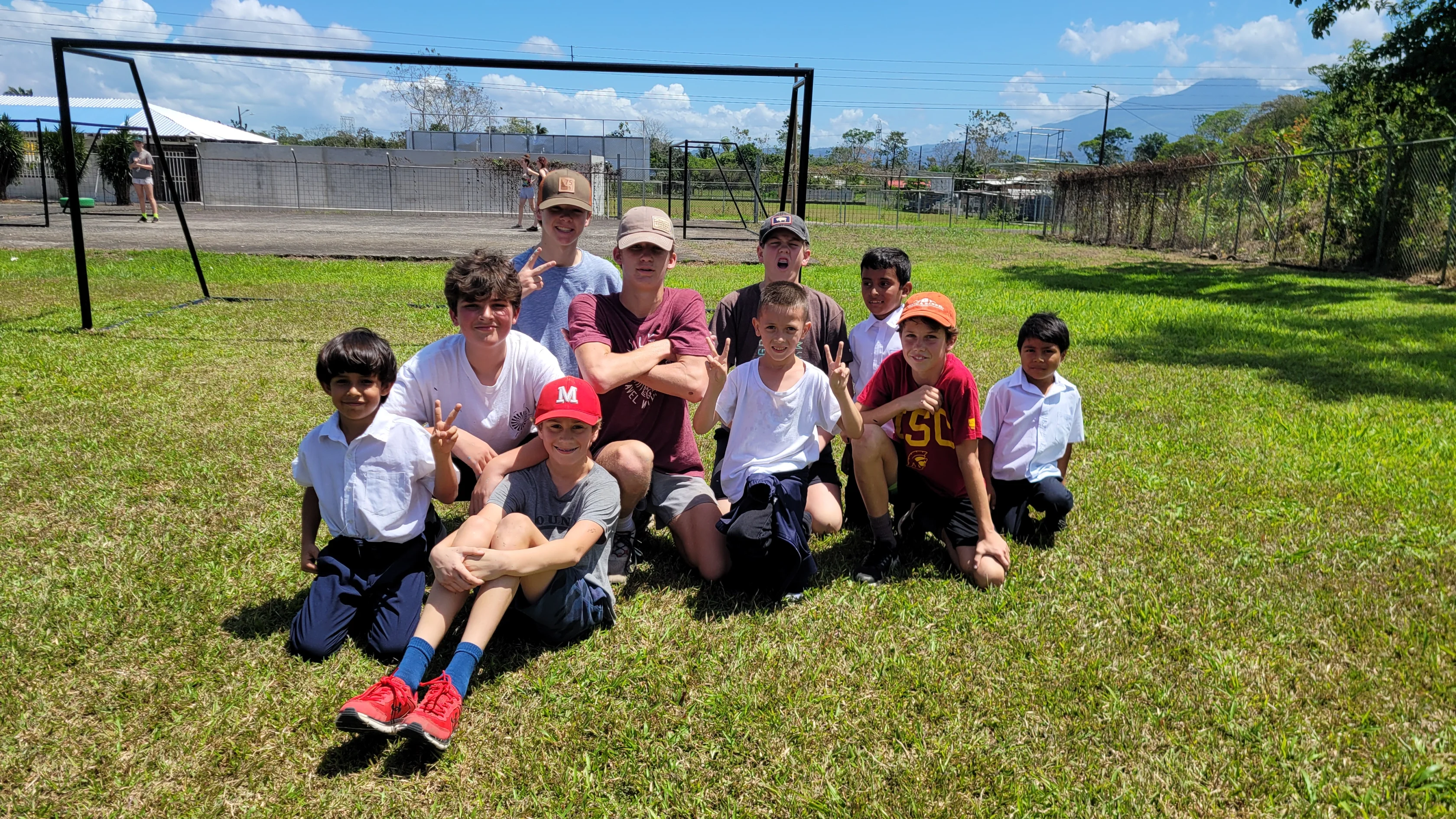 A group of children and two adults pose on a grassy field with a soccer goal in the background under a clear blue sky.
