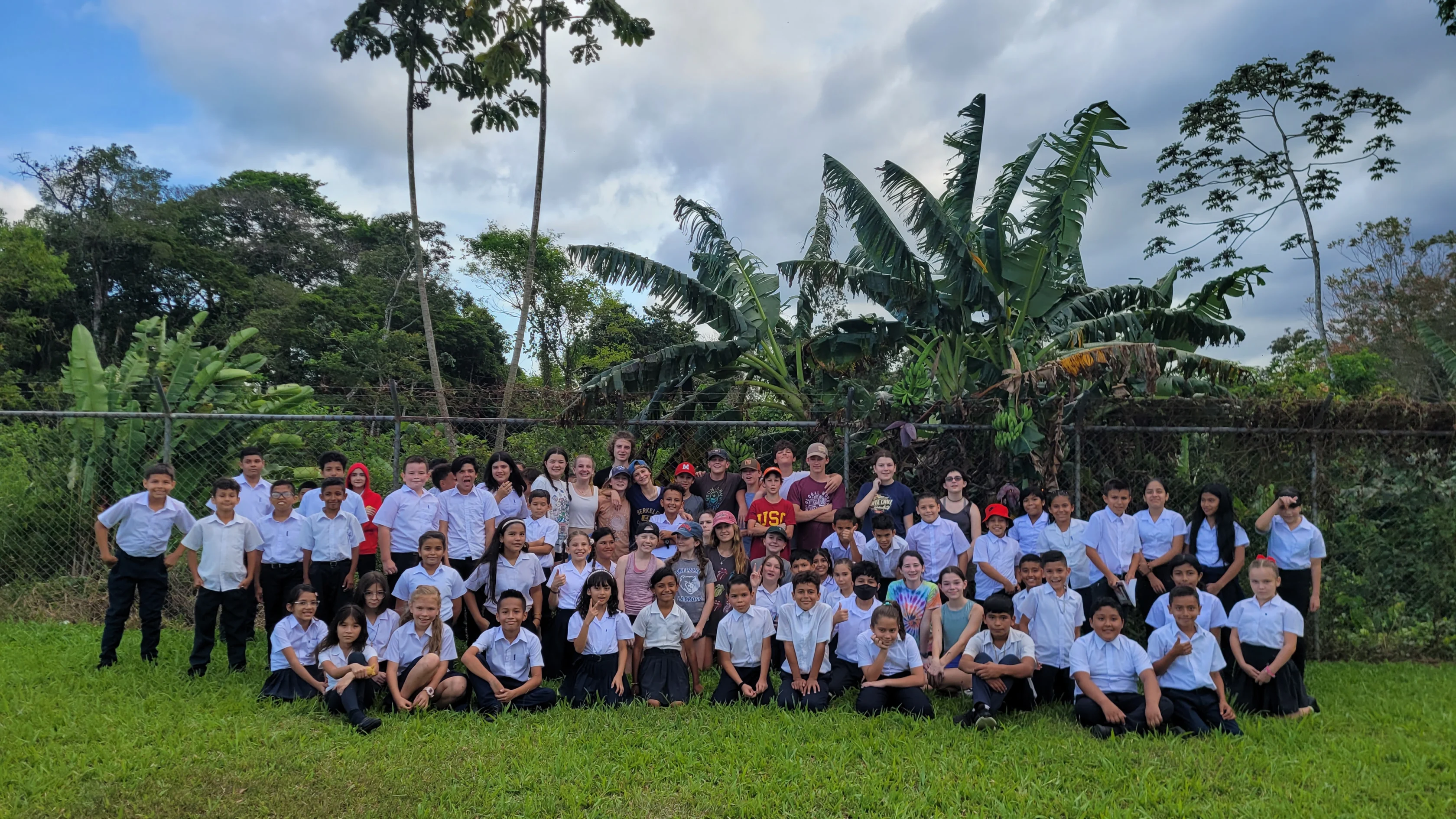 A large group photo of students and teachers standing and sitting on grass, with trees and a fence in the background.
