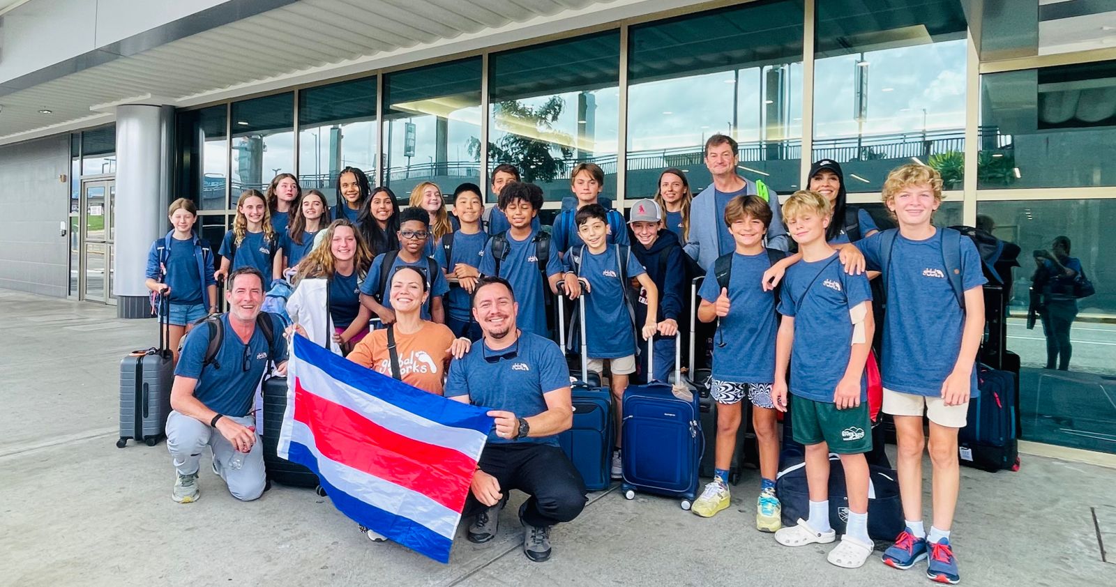 A group of people in matching blue shirts pose with suitcases and a Costa Rican flag outside a building.