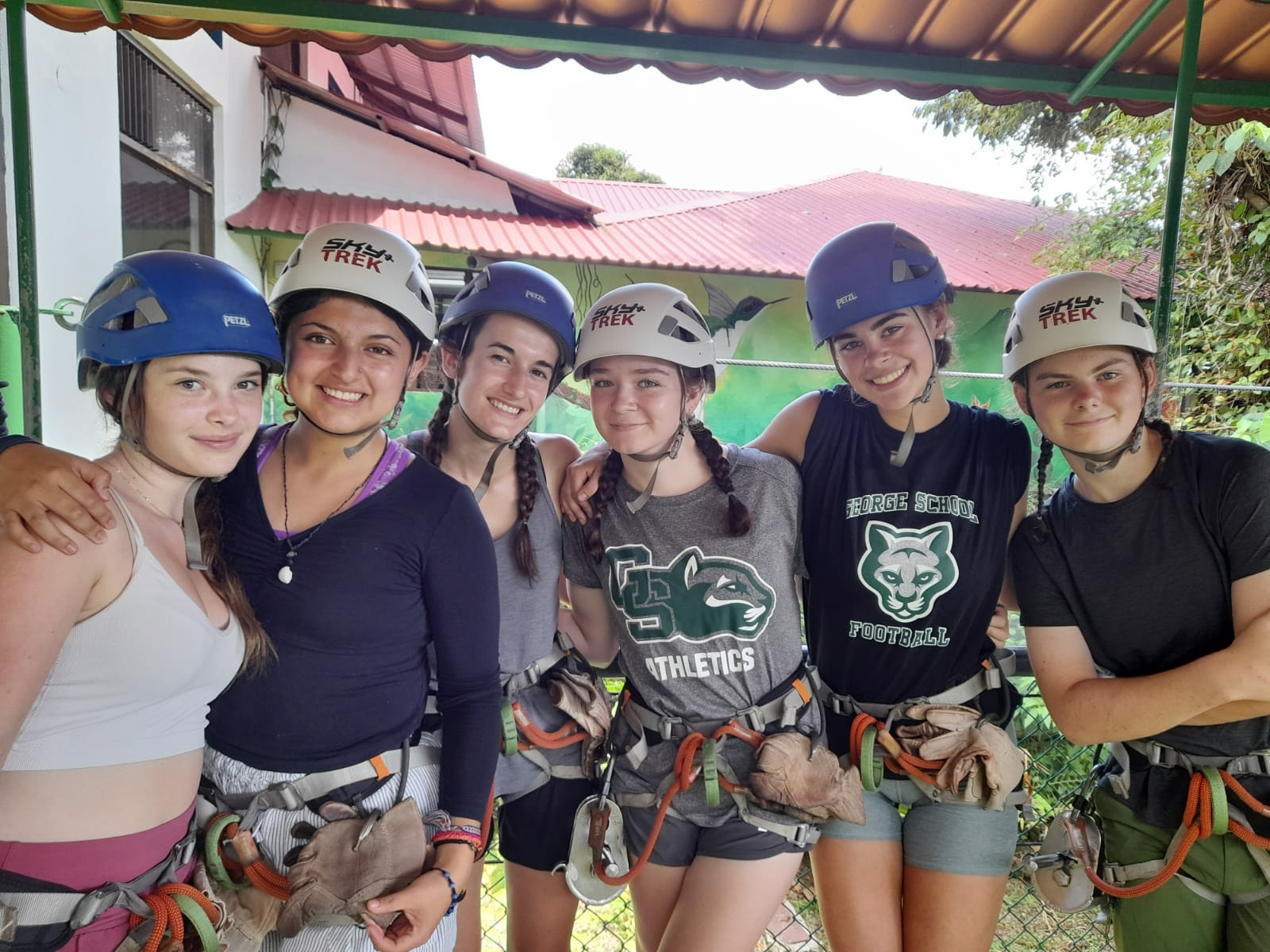 Six people wearing helmets and harnesses stand together under a canopy, smiling at the camera. They appear ready for an outdoor adventure activity.