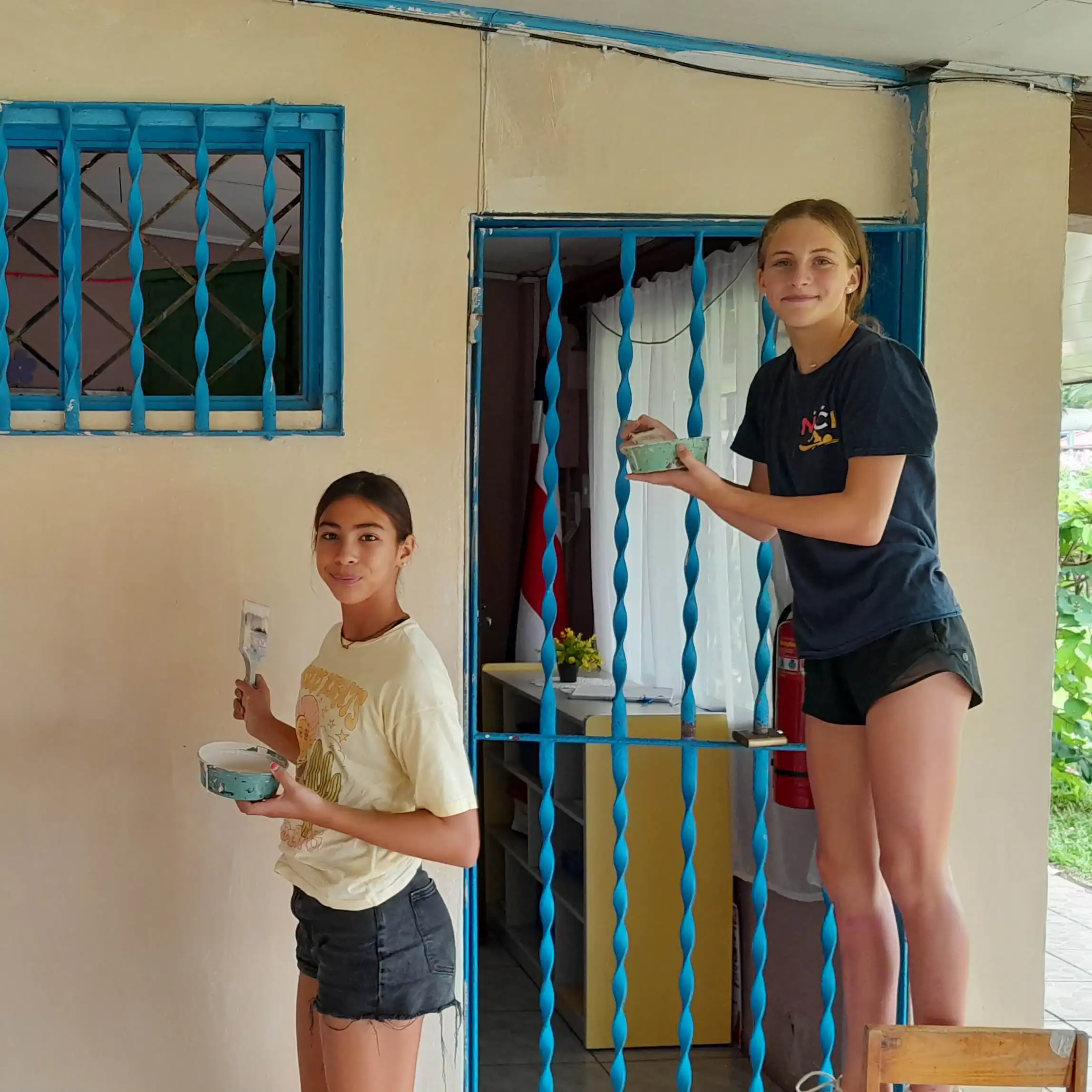 Two young people on a Costa Rica student travel experience paint the outside wall and metal bars of a building. One stands on a chair with a paint tray, while the other adds color to the wall.