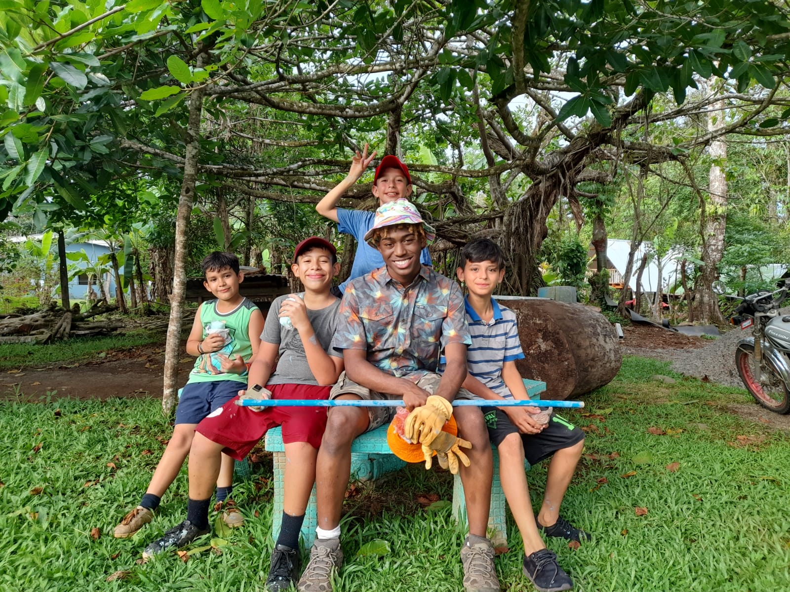 A group of five smiling boys are sitting on a wooden bench under a tree. The central boy holds gardening tools. They are outdoors in a grassy area with a scooter nearby.
