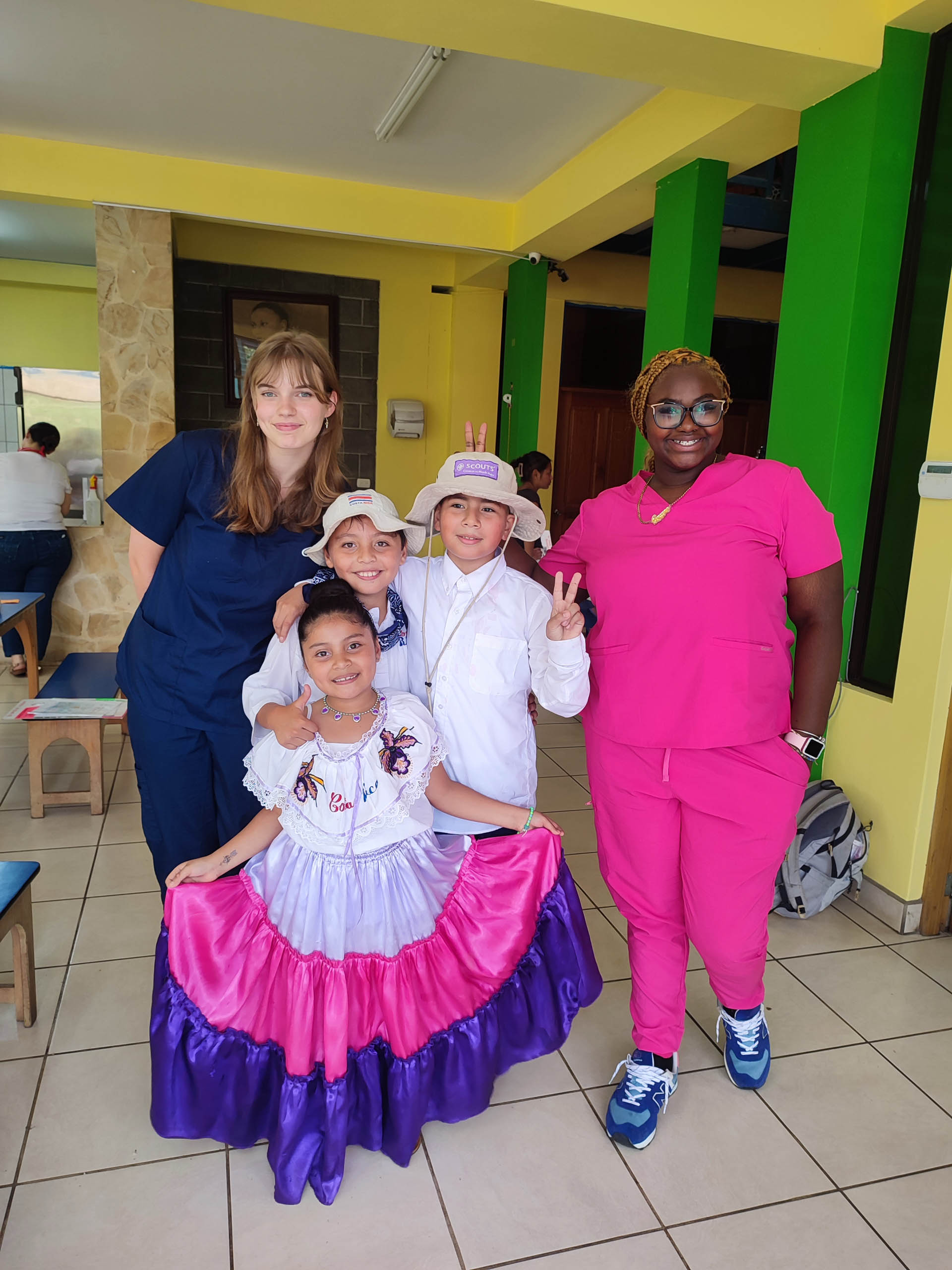 Two adults in scrubs and three children in colorful costumes pose together indoors.