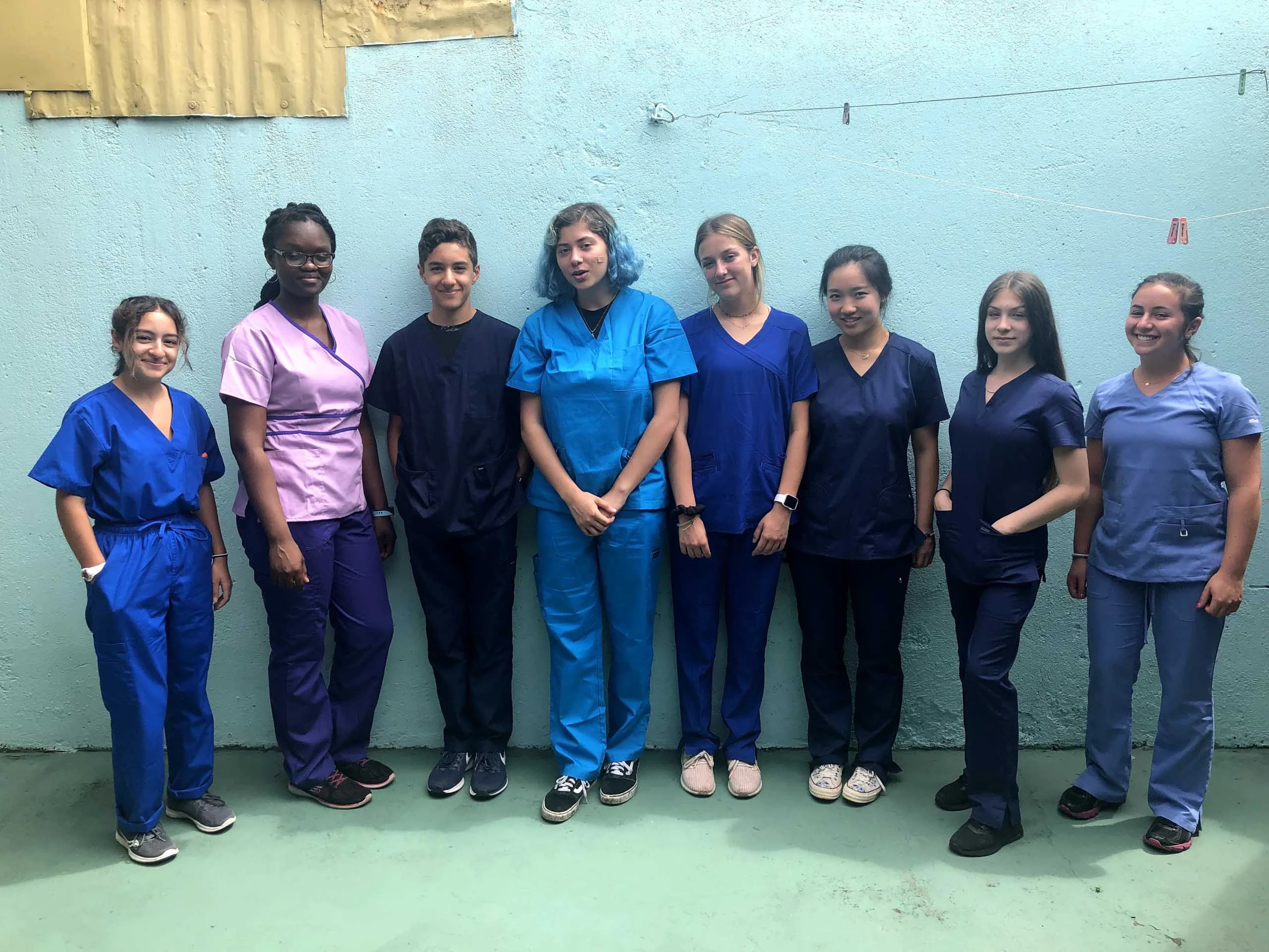 A group of eight people standing in scrubs against a light blue wall.