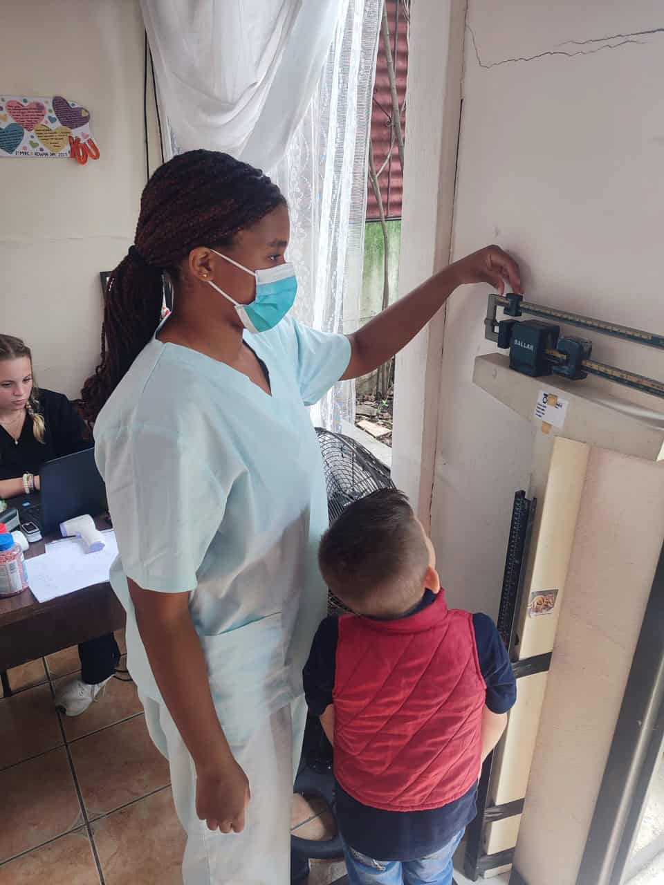 A nurse measures a young boy's height using a wall-mounted scale. The boy faces away from the scale while the nurse adjusts the measurement bar. A person sits nearby at a desk.