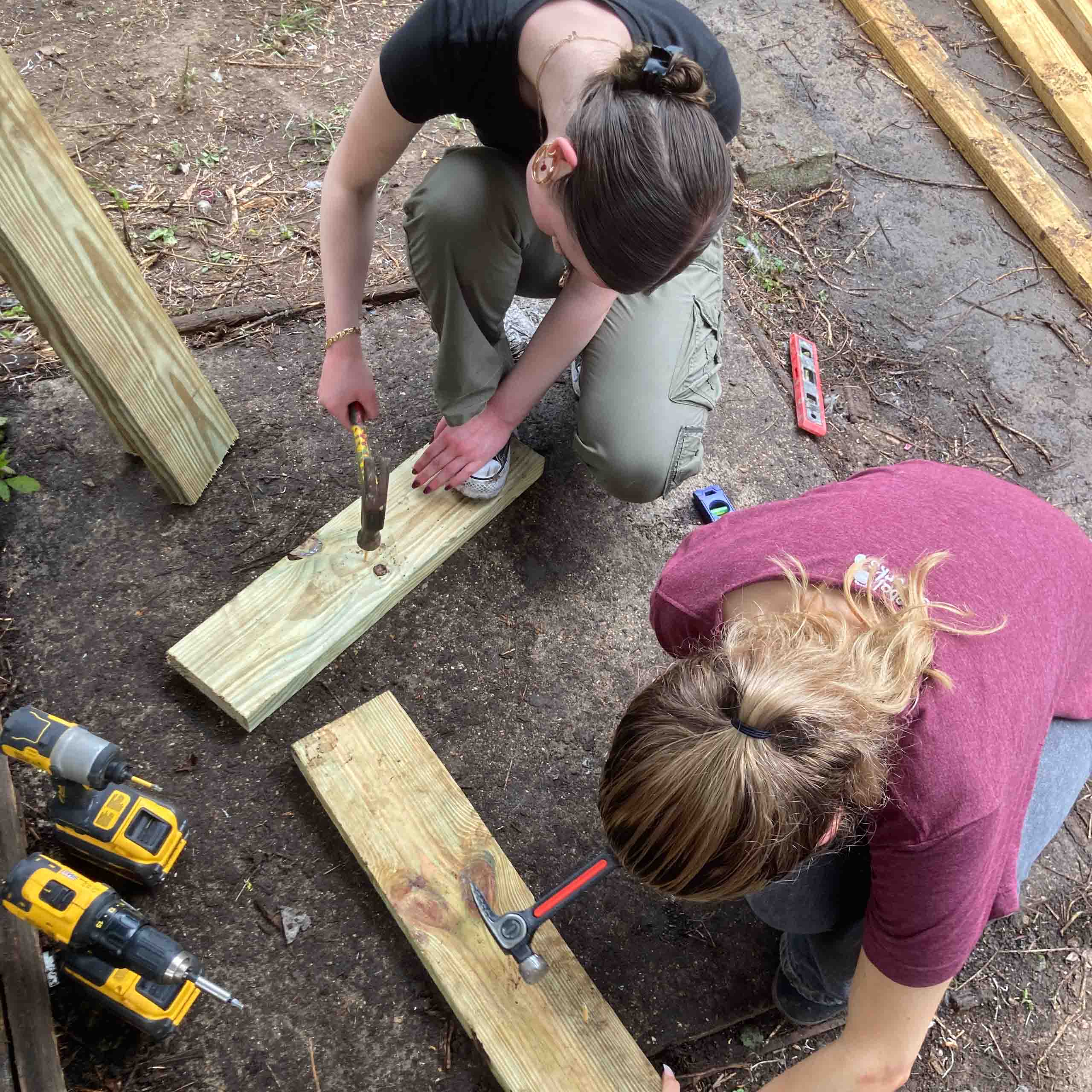 Two people crouch on the ground, assembling wooden beams with drills and a hammer. Construction tools are scattered around them.