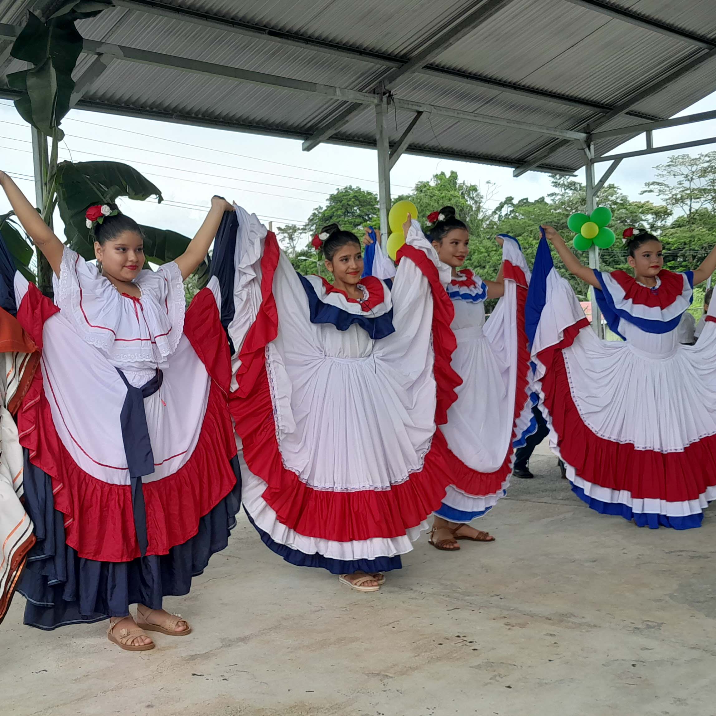Four women perform a traditional dance in colorful, layered dresses under a canopy.