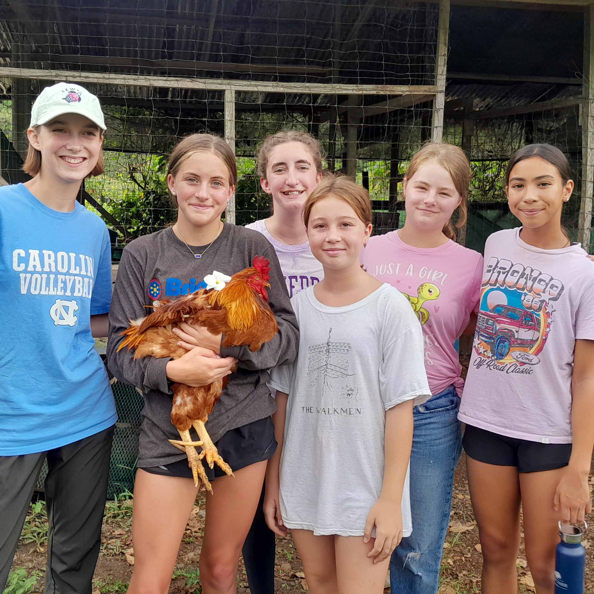 Six young people stand together, one holding a chicken, in front of a coop.