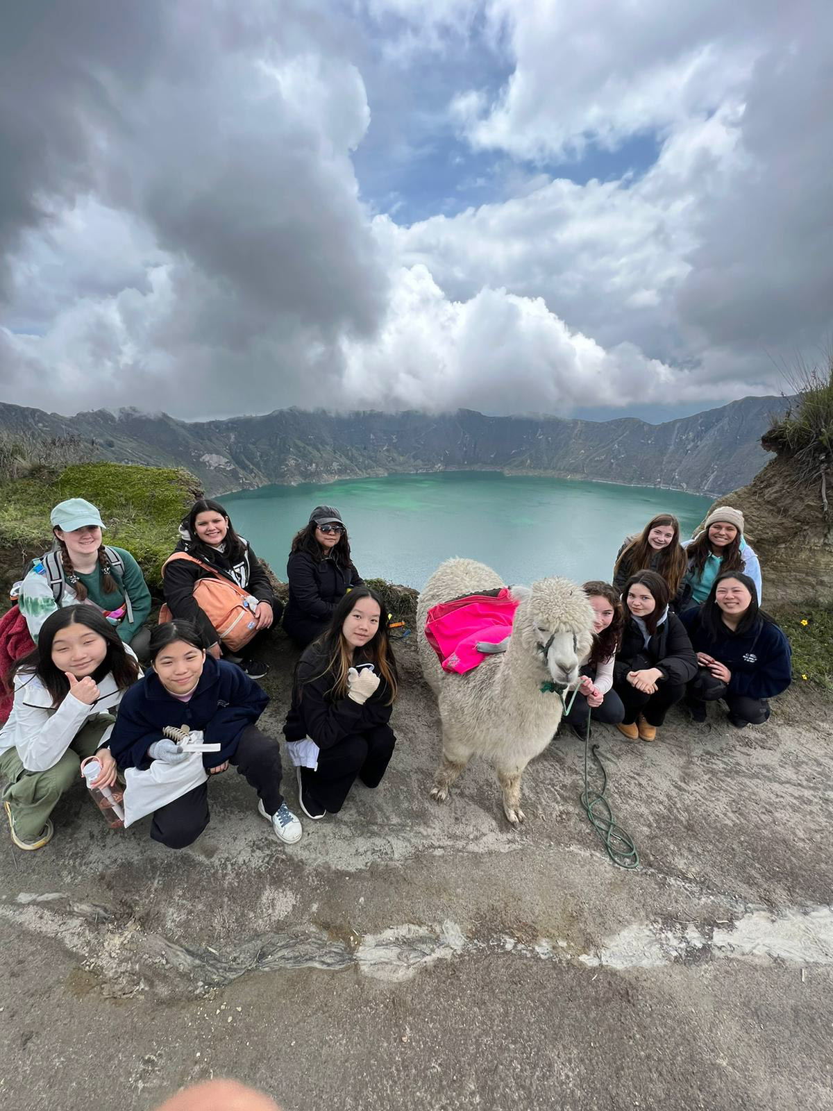 A group of people kneels on a path near a llama with a pink saddle, in front of a lake surrounded by mountains under a cloudy sky.