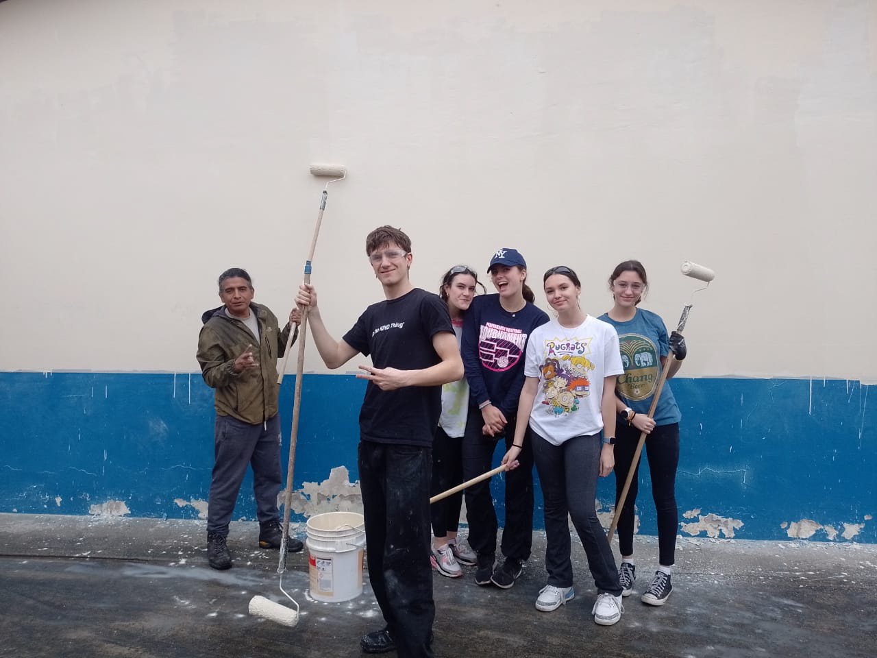 A group of six people holding paint rollers stand in front of a freshly painted wall, with a blue section at the bottom. They are posing for the photo and smiling.
